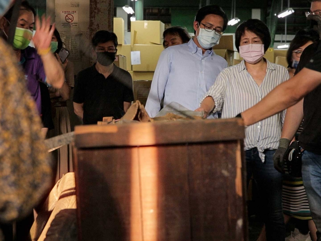 數十年來張家背負的重軛終於放下了,但對北師美術館來說才正要扛起。很快北師美術館團隊跟張家議定時間,前往霧峰進行睽違47年的開箱工作。由於封存時間久遠,許多張家後代也從未得見《甘露水》的真面目,連同前去的北師美術館團隊,都懷抱興奮而緊張的心情。從現有釋出的影片來看,《甘露水》被塑膠袋與麻布袋層層包裹,外面再以木箱封裝。因為時間久遠,包裝的材料劣化嚴重,幸而《甘露水》除了髒汙之外,外觀仍維持完好。