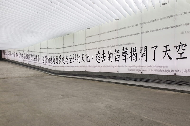 科史士(Joseph Kosuth)於機場捷運A1台北車站創作的公共藝術《紛紛從田裡飛起,2013》(One Field to the Next, 2013)。圖/台北當代藝術館