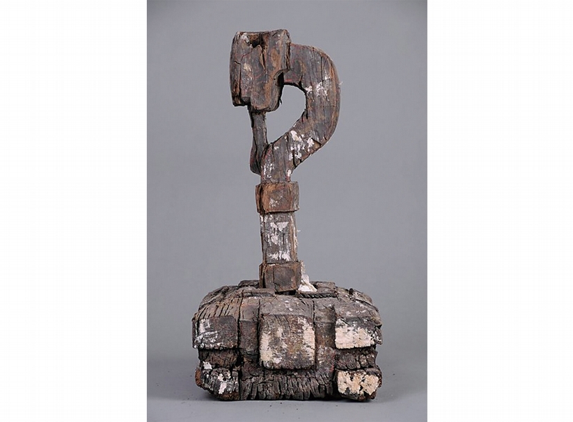 戰國〈彩繪漆鎮墓獸〉,通高45.3公分。