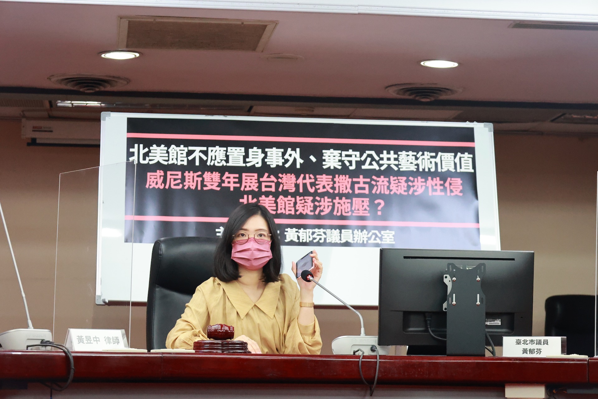 黃郁芬亦從市議員的角色提出監督,嚴正呼籲北美館必須公佈、澄清與撒古流的相關溝通過程,以正視聽。她也回應,北美館雖沒有實質的法律調查權,但公部門契約通常會有相應條款,規範雙方在遭致形象受損之際,得主動終止合作。她相信本案已引發外界嚴重疑慮,並提出藝術文化工作者的聯合聲明佐證,該連署在短短不到一天內,即蒐集超過五百位工作者簽署。