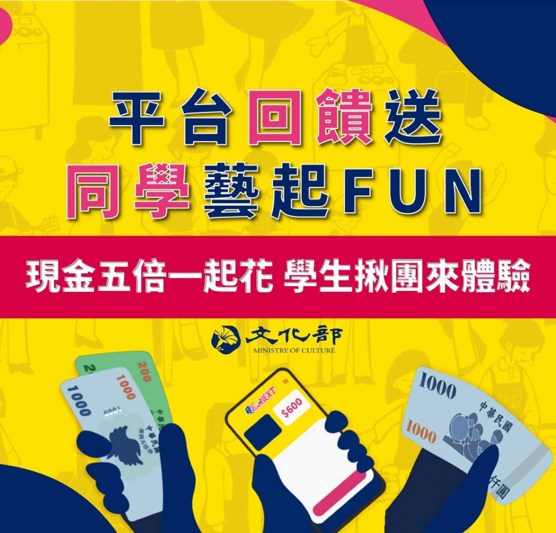 因應肺炎疫情對藝文產業所造成的衝擊,文化部連續兩年發放「藝FUN券」鼓勵民眾增加藝文活動消費,成效良好。為培養藝文消費人口,讓參與藝文活動的習慣向下扎根,文化部於27日宣布,將與9家合作票券平台合作,消費滿千回饋20%,只要符合具本國學籍在學學生(含僑生、國際學生)身分,包含中小學、高中職、大專碩博士(含在職班),以及學齡前孩童,都可參與此方案,家長親友亦可一起參與。