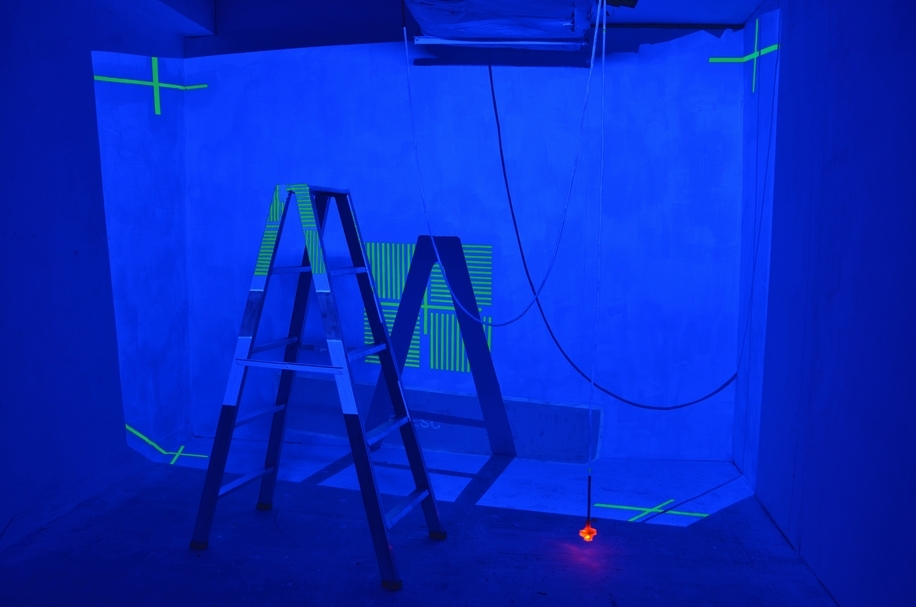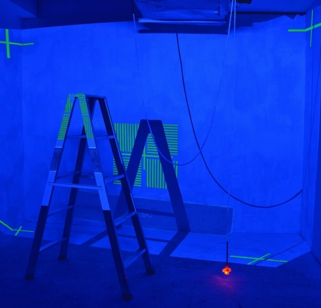 「集思廣益.當代藝術賞」首獎作品,謝佑承《校準:投影》(Calibrate: Projection),螢光漆、螢光燈管、現成物,238x308cm,2017。(謝佑承提供)