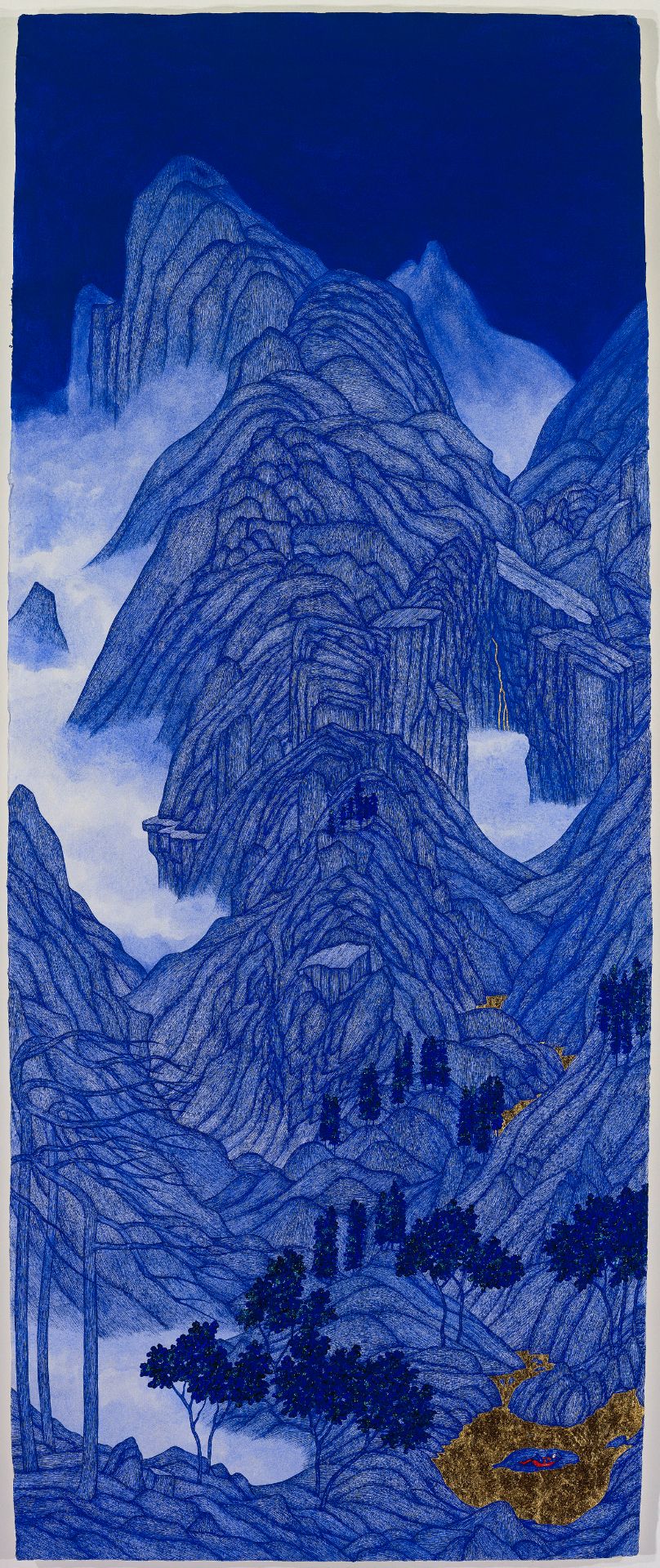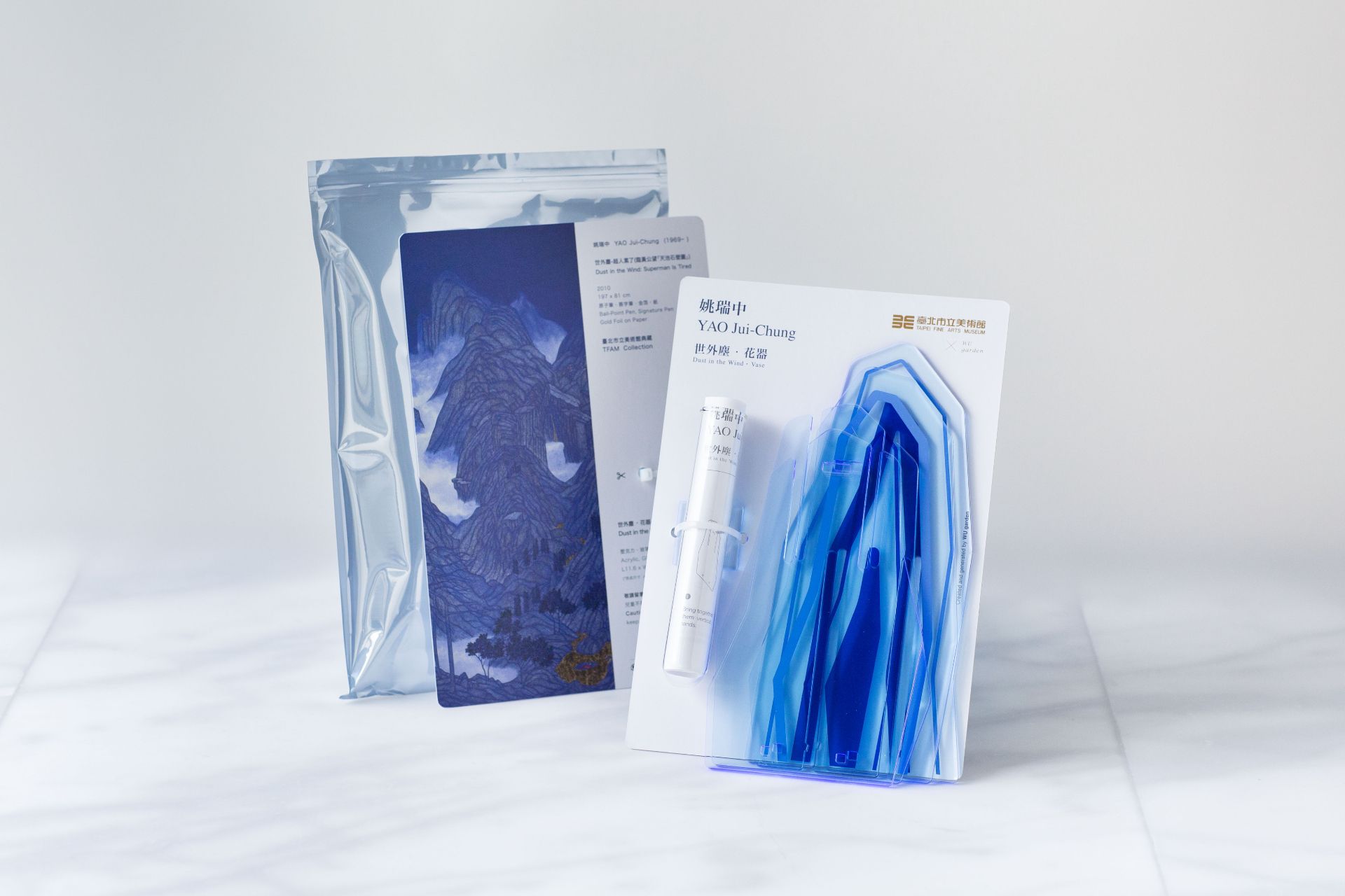 藝術家姚瑞中擅以攝影、裝置及繪畫等跨媒材的創作語彙對多重議題進行探討與翻轉,如反思過往威權統治、深究臺灣民間宗教信仰的現象等,以其獨有之幽默與戲謔手法撩撥當今社會與歷史的空隙,帶來嶄新觀點。本次衍生品所採用北美館之典藏作品《世外塵─超人累了(臨黃公望「天池石壁圖」)》,是姚瑞中自2007年開始進行的作品系列之一。在這個系列中他改寫並挪用中國美術史經典畫作,試圖將宏大史詩文本轉化為個人自傳敘事,以「偽山水」策略對所謂的正統性進行篡位。在這件作品中,藝術家以原子筆和簽字筆臨摹元代畫家黃公望的代表作《天池石壁圖》,用極細緻的線條堆疊出不同深淺的藍色層層山巒,讓古與今產生有趣的對話與新意。