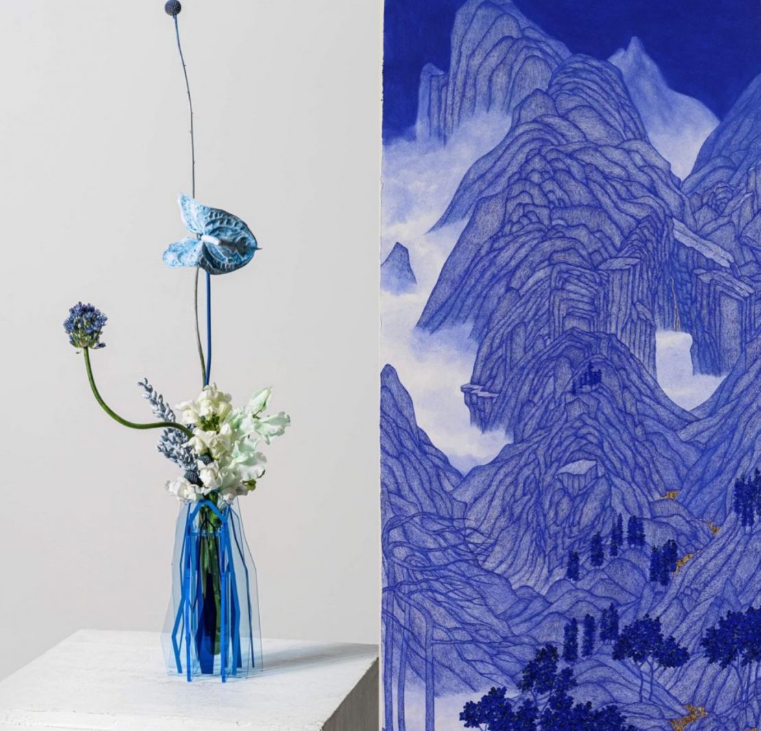 「無園藝WU garden」主理人吳立緯汲取作品中的紋理、顏色為元素,以其熟稔的壓克力材質,設計出一款輕盈透亮的組合式花器。四片花器的構成壓克力組件,取畫作中山脈輪廓為造型,互相嵌合後,其上色調與粗細相異的藍色印刷線條與邊緣的稜線在空間中交疊,巧妙將平面層疊的山巒轉成立面後收攏集聚,成為可從各個視角賞玩的微觀風景。放入玻璃試管即可作為花器,置入花草便能增添室內生機盎然的逸趣。吳立緯秉持其多年栽種植物的熱情與經驗,致力於結合植物與其專擅的壓克力或其他新創媒材,不斷挑戰既定園藝型態,催化出人與自然的嶄新介面,本次合作更進一步解構平面藝術作品、重組於立體空間中,以其設計力將藝術帶入生活美學場域。