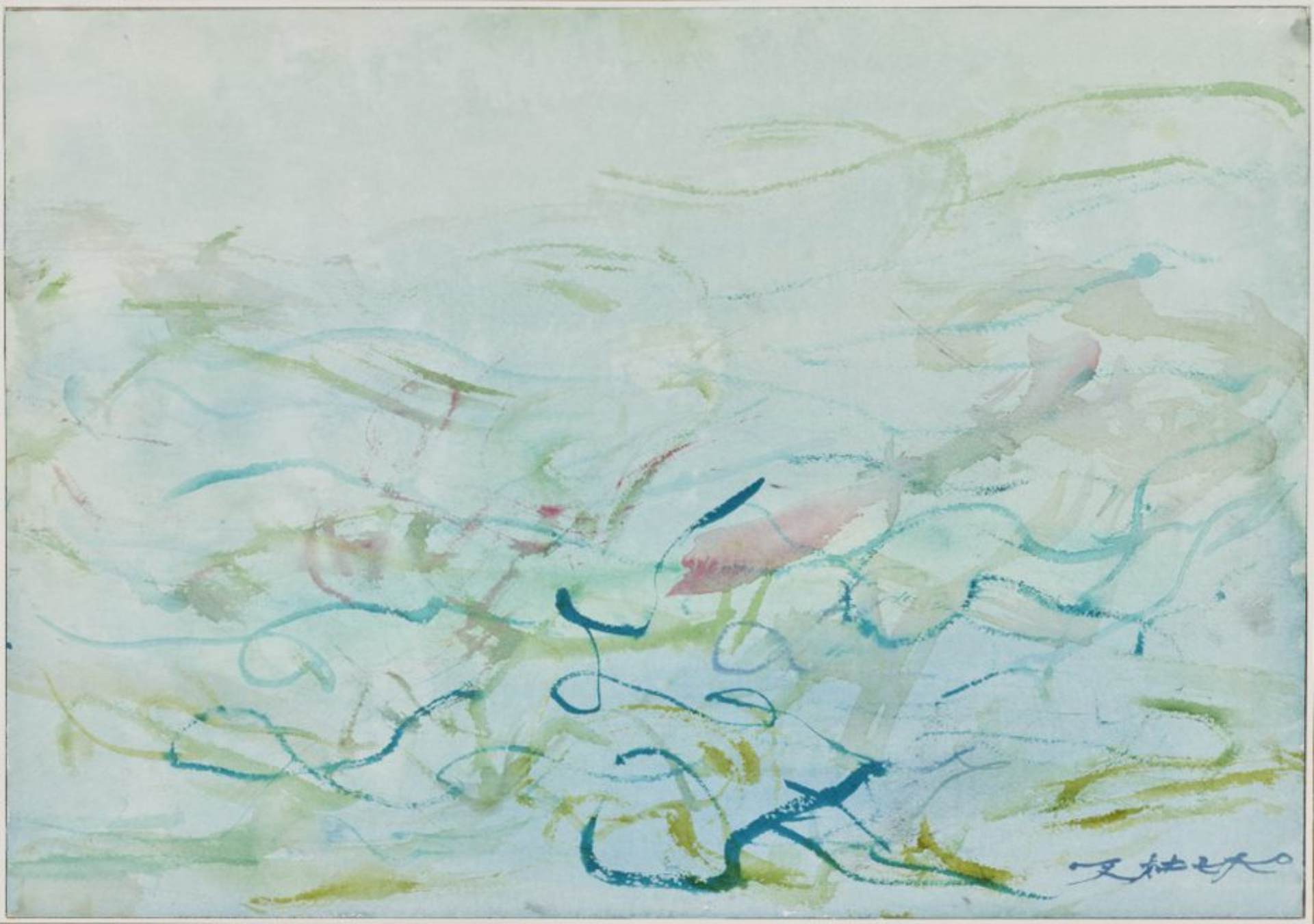 水彩畫《無題;比亞里茨》(2005)創作於他經常到訪的法國西南部海濱度假小鎮,明顯描繪他對水面波光粼粼的印象。這幅作品繪於趙無極人生最後的十年間,多種屈折轉向的筆觸灑脫奔放,承繼他一貫將自然融入畫中的風格,充分顯露他晚期創作的從容和自信。