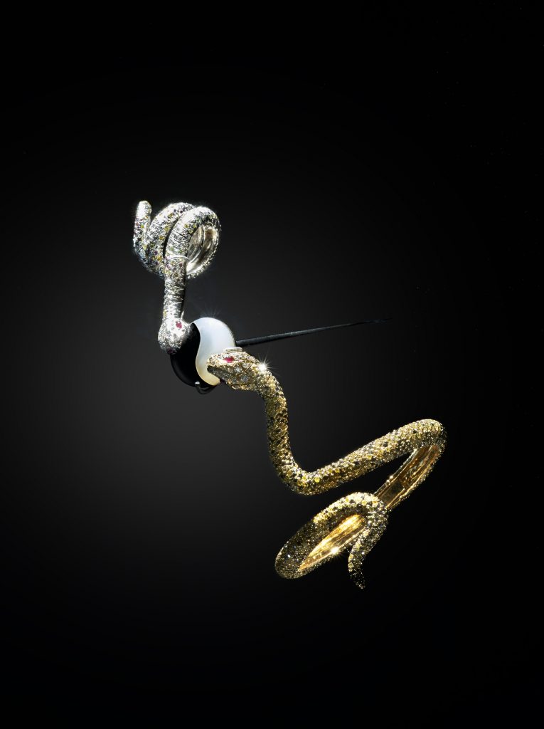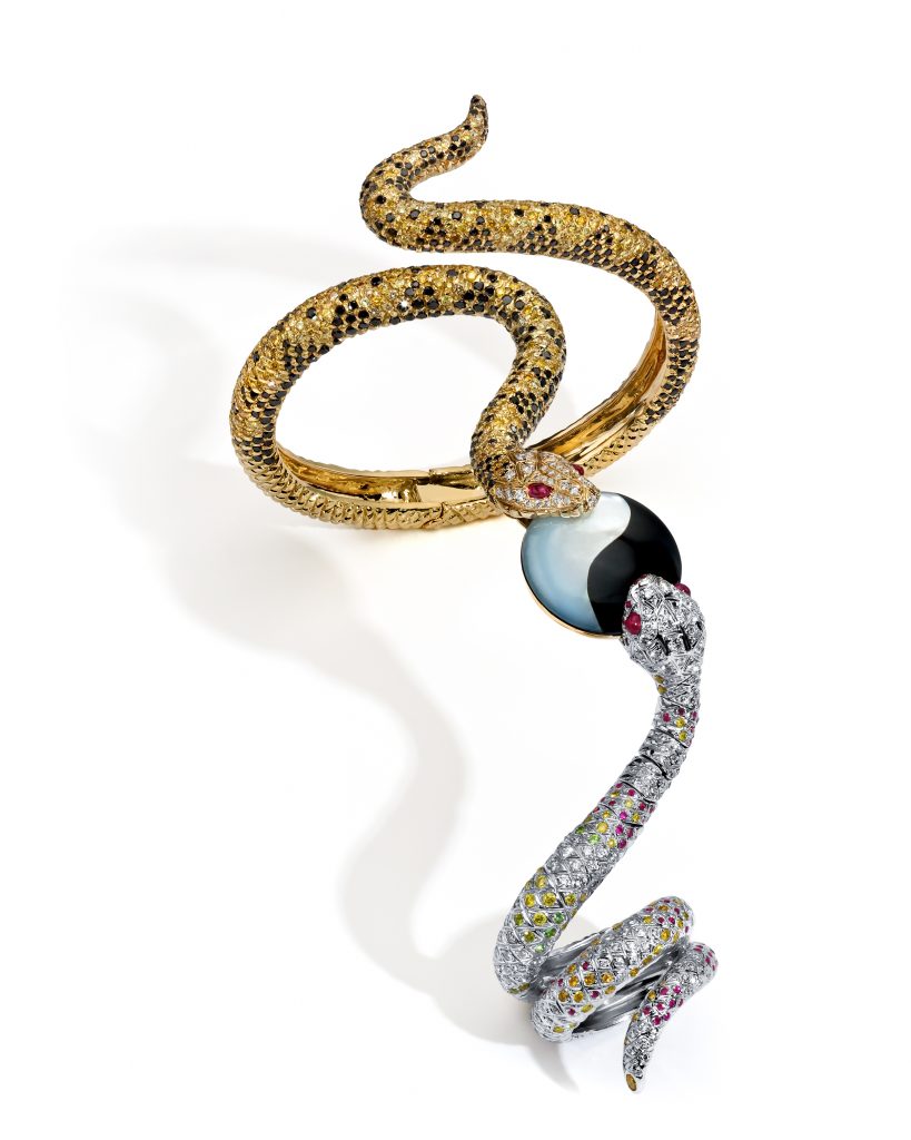 ANNA HU 太極蛇形戒鐲以雙「蛇」做為主體設計,以由珍珠母貝與黑瑪瑙製成的太極作為中心點巧妙銜接,讓金蛇與銀蛇生動地纏繞著手指與手腕,亦是戒指、亦是手鐲,強調陰陽調和中立之道,以西方精湛立體工藝交錯與結合的美感,反映東方文化內斂中庸之美,珠寶隨著手部動作靈活之姿,更蘊含著「雙龍戲珠」,生生不息周而復始的寓意。手鐲獨特的雙蛇形設計由18K 黃金和18K 白金組成,各鑲有總重8.8克拉的白鑽、黑鑽、黃鑽和石榴石,蛇眼由鴿血紅紅寶石鑲嵌而成,細緻優雅,整件作品完美體現 Anna Hu 結合西方製作工藝與東方文化美學的深厚藝術底蘊,也是這件作品受到國際間舉足輕重、當代藝術權威博物館典藏的主要原因。本作品在品牌創立15週年之際,受到巴黎羅浮宮西翼裝飾藝術博物館收藏並於其珠寶廊(La Galerie des Bijoux)永久展出,更是 Anna Hu 投身於珠寶藝術創作以來、再度令人驚嘆的重要里程碑之一。