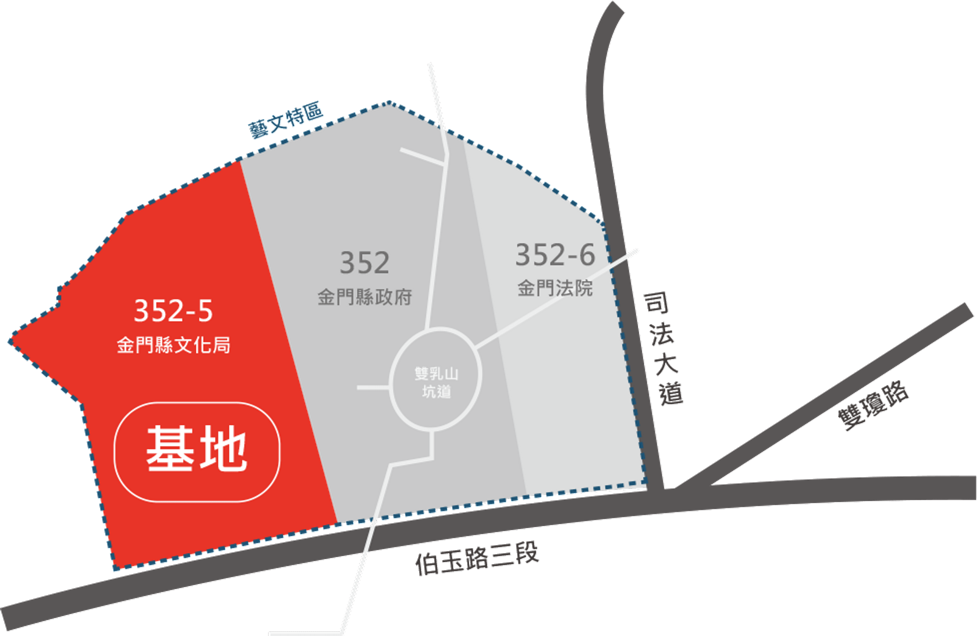 金門縣政府說明,基地位於金門縣金寧鄉后盤山段 352-5 地號,基地面積約38,225 平方公尺,位於金寧鄉與金湖鎮交界附近,南側鄰近中山紀念林,是金門縣縣民假日休憩景點。基地區位良好、交通便利,位於金門島橫向主要幹道伯玉路中段位置,串聯金城市區7 分鐘車程、山外市區10 分鐘車程、沙美市區10 分鐘車程,基地與金門島三處主要生活核心連接便利,未來將結合藝文特區、中山紀念林創造金門縣藝文休憩一日生活圈。