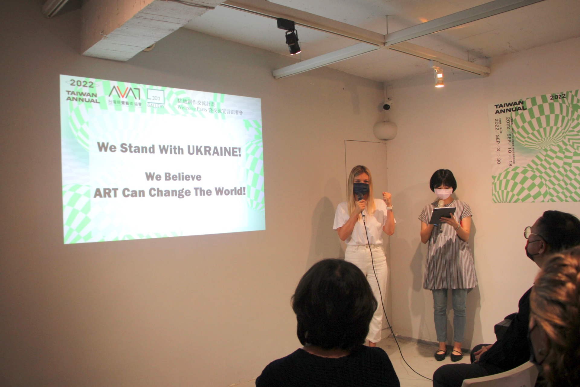 視盟理事長蘇瑤華首先感謝文化部的支持,也感謝在烏俄戰爭這個艱困的時間點,仍能有藝術交流活動。長期關注藝文圈的立法委員吳思瑤則在致詞時提到,文化交流與藝術平權一直是她所關心的議題,而當前的烏俄戰爭並不只是國與國的戰爭,同時也是文化與藝術的保衛戰。台灣作為國際社會的一分子,不能成為局外人,無論是烏克蘭藝術家尋求庇護的協助,或是駐村交流都是需要積極推動的項目。委員吳思瑤再次說到:「 Taiwan Can Help. 」戰爭當前,台灣可以給國際友人更多的支持。記者會現場也播放 Green Sofa Gallery 創辦人 Olesya Domaradzka 的影片,感謝台灣對於烏克蘭的支持,也希望國際持續關注戰爭的發展。