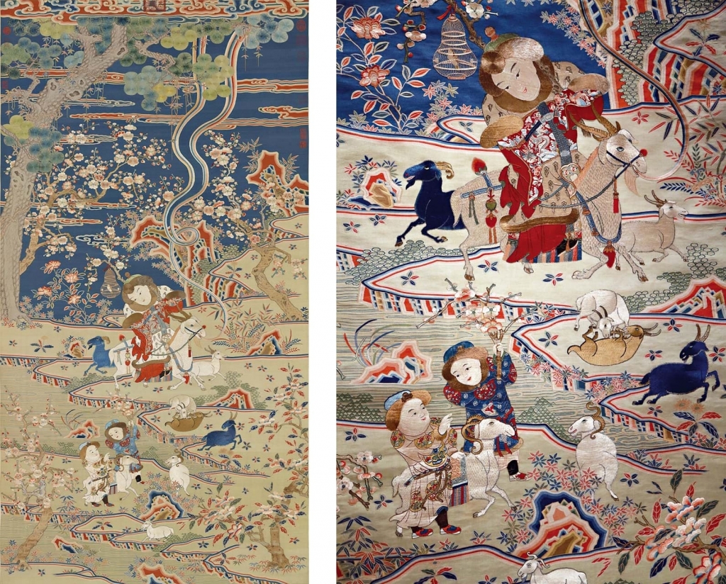 明星展件清乾隆〈緙繡九羊啟泰圖〉尺幅巨大,高達218公分,以緙絲搭配刺繡,煥彩華美,為清代宮廷中依時節更替的掛軸,畫中太子手持梅枝搭配籠中喜鵲,隱含「喜上眉梢」之意,農曆春節將至,應景喜氣。