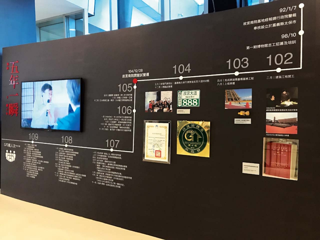 國立故宮博物院副院長黃永泰表示,故宮南院於2003年1月經行政院核定設立於嘉義縣太保市,2015年12月28日開館以來屆滿五週年,在同仁們的努力及各界支持下成長茁壯,已籌辦超過51檔展覽,累積超過570萬參觀人次的肯定,南院不斷更新提升,今年(2020)觀眾再度突破100萬人次,「感謝國人對故宮南院的照顧和支持,故宮南院走過外界認定的蚊子館,到今天超過104萬的參觀人數,成為國旅打卡據點,不論是室內展覽接地氣,戶外景觀、水幕光雕、馬拉松等多樣化的活動,促使國人接受南院,這是我們一直往前推動的原動力。」南院動土儀式用的金鏟子、銅構工程用的螺栓、南部院區的故宮大道「888」門牌等諸多照片集錦,以及由觀眾、志工、館員們交織出的紀念影片,共同呈現於「南院時光紀念展」廊道,邀請大家與南院攜手邁向未來,預約下個十年。