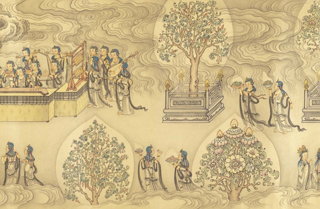 策展人南院處助理研究員林容伊表示,遠方的神樹暗指仙境的所在,展廳入口的清代沈源1744年作〈極樂世界圖〉本幅長達5公尺,為乾隆皇帝要求宮廷畫家沈源參考唐末五代畫家貫休〈極樂圖〉的稿本所繪製,乾隆楷書題字引首「西方極樂世界阿彌陀佛安養道場」,畫幅細膩描繪了阿彌陀佛淨土中遍生寶樹,清風吹拂時發出妙音的祥和氛圍,有著珍禽和華麗寶樹的極樂世界。