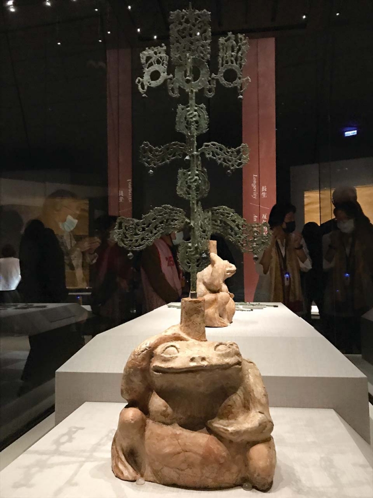 策展人南院處助理研究員林宛萱說明,本次借展國立歷史博物館館藏漢〈褐綠釉桃都樹〉及東漢〈搖錢樹〉上有各種與昇仙相關的圖像,如金雞、蟬、蟾蜍、搗藥玉兔等,蟬象徵羽化及再生,蟾蜍及玉兔則為西王母使者,神樹除了營造仙境氛圍,同時也呈現庇佑子孫富貴的祈願。〈搖錢樹〉為東漢時期盛行於中國西南地區之墓葬明器,以青銅鑄造枝葉插放於陶質基座,但因年代久遠不宜直立展示,為保護文物且恢復原樣,首度以3D列印技術製作複製品,本尊與分身同時展出,觀者可細細比較古今之別。