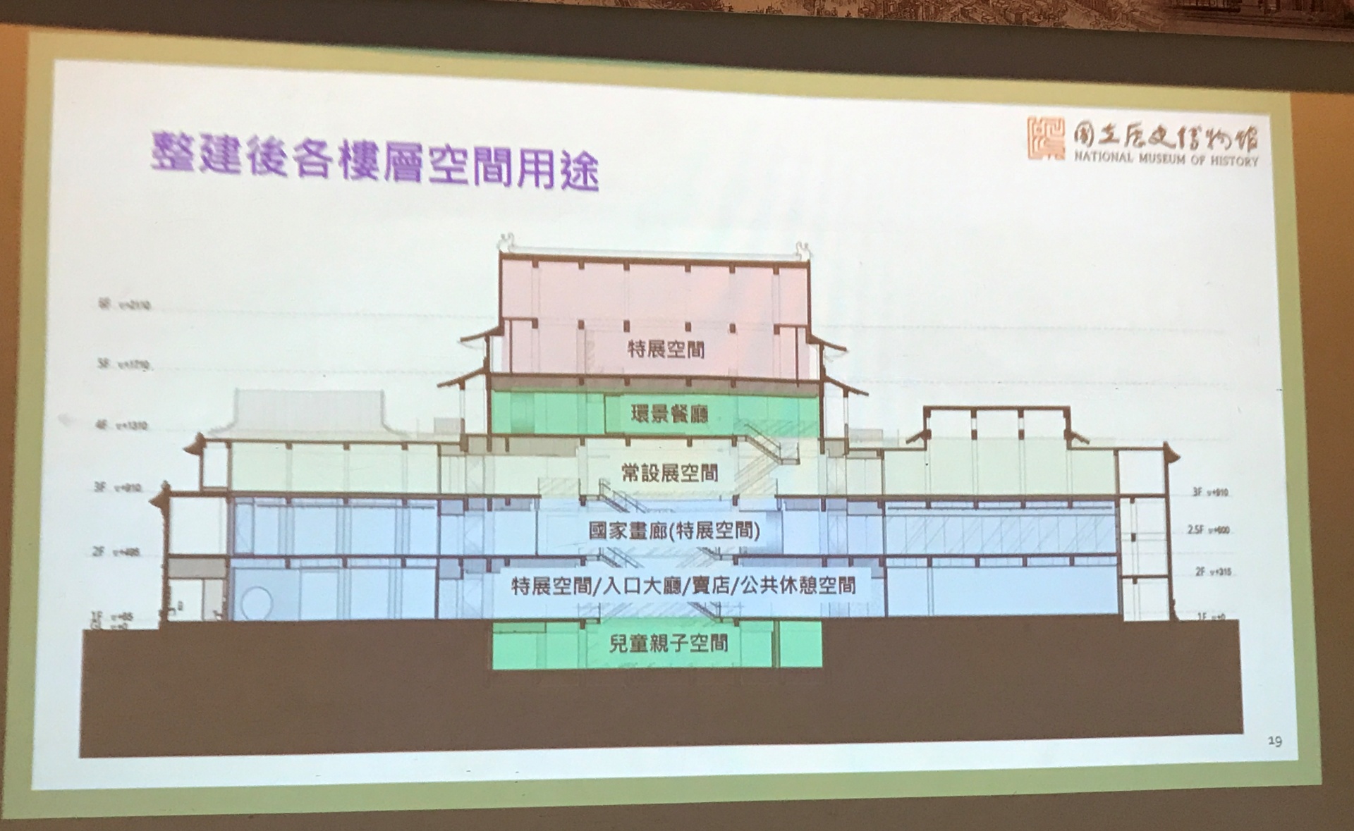 整建前後,最大的改變為展場空間的增加,將增加261.77坪。樓層規劃中較明顯的有:B1的會議廳改為兒童親子空間;2樓的特展空間、微型咖啡廳、行政辦公室全數整併為國家畫廊特展空間;3樓的常設展空間、行政辦公室整併為常設展空間;4樓的特展空間、微型咖啡廳改為環景餐廳;5樓的典藏庫房改為特展空間。原先的行政辦公室空間現規劃移至文化部南海工作坊(南海路20號九樓)。