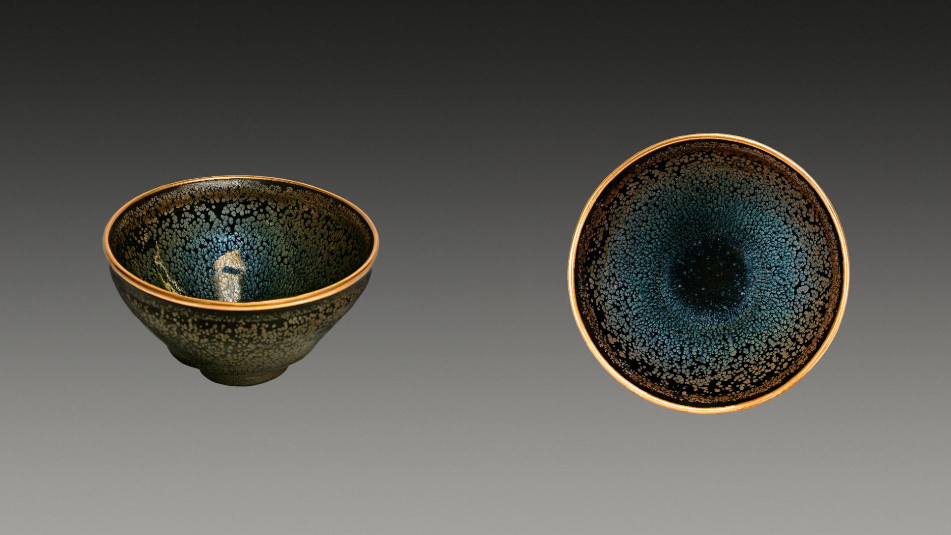 「天目」為日本獨有稱呼,緣起於鎌倉時代(1185-1333)前往浙江臨安天目山附近禪宗(臨濟宗)寺院修行的日本留學僧,將當時寺廟中飲茶用的黑釉碗帶回日本,之後成為黑釉茶碗的通稱。而先前所說的八件中國陶瓷國寶中,天目茶碗有五件,可見天目茶碗在日本文化中占有的重要地位。《南宋建窯油滴天目茶碗》,名稱取自於釉藥表面生成如油滴般的斑紋,此碗品相絕美完整。細觀之,黑釉上密密麻麻的銀色斑紋,閃耀著炫目的藍、金等虹彩,如夢似幻般絢麗華美。大阪市立東洋陶磁美術館學藝課長代理小林仁介紹:「口緣處嵌有應當是到日本後才添加的高純度金覆輪,豪華感倍增。重349公克,是捧在手上相當舒心的重量。本作曾由關白豐臣秀次收藏,後由西本願寺、京都三井家、若狹酒井家遞藏,是傳世油滴天目的最高傑作。」