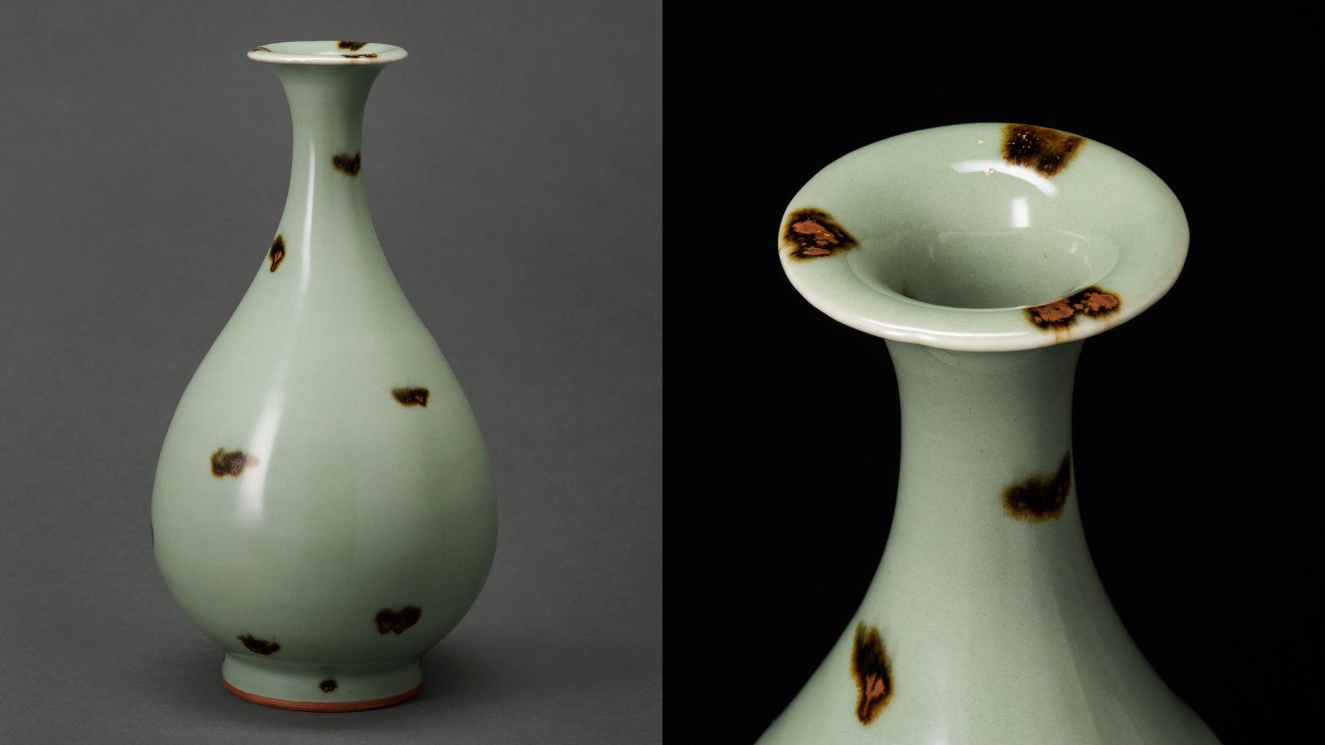 《元龍泉窯飛青瓷花生》此件作品為日本八件中國瓷器國寶中唯一的一件元代龍泉窯青瓷。器身散布鐵斑紋的龍泉窯青瓷,在日本被稱為「飛青瓷」,或有著鐵斑飛散於青瓷之上、鐵斑紋經風吹而翻飛如雲之意;「花生」亦是日本的獨有說法,指使花繼續生長並用作裝飾的花器之意。鐵褐斑紋與青釉產生對比強烈的質感及視覺感受。小林仁更是細看,「圈足的接地處起往上五分分左右,釉被刮除,露出胎體,又因為氧化之故,露胎部分呈現鮮豔的紅褐色。圈足周圍的紅褐色,與青瓷明亮的青綠釉色和鐵斑的褐色,形成優異的色彩對比,為外觀增添了安定感與特色。」