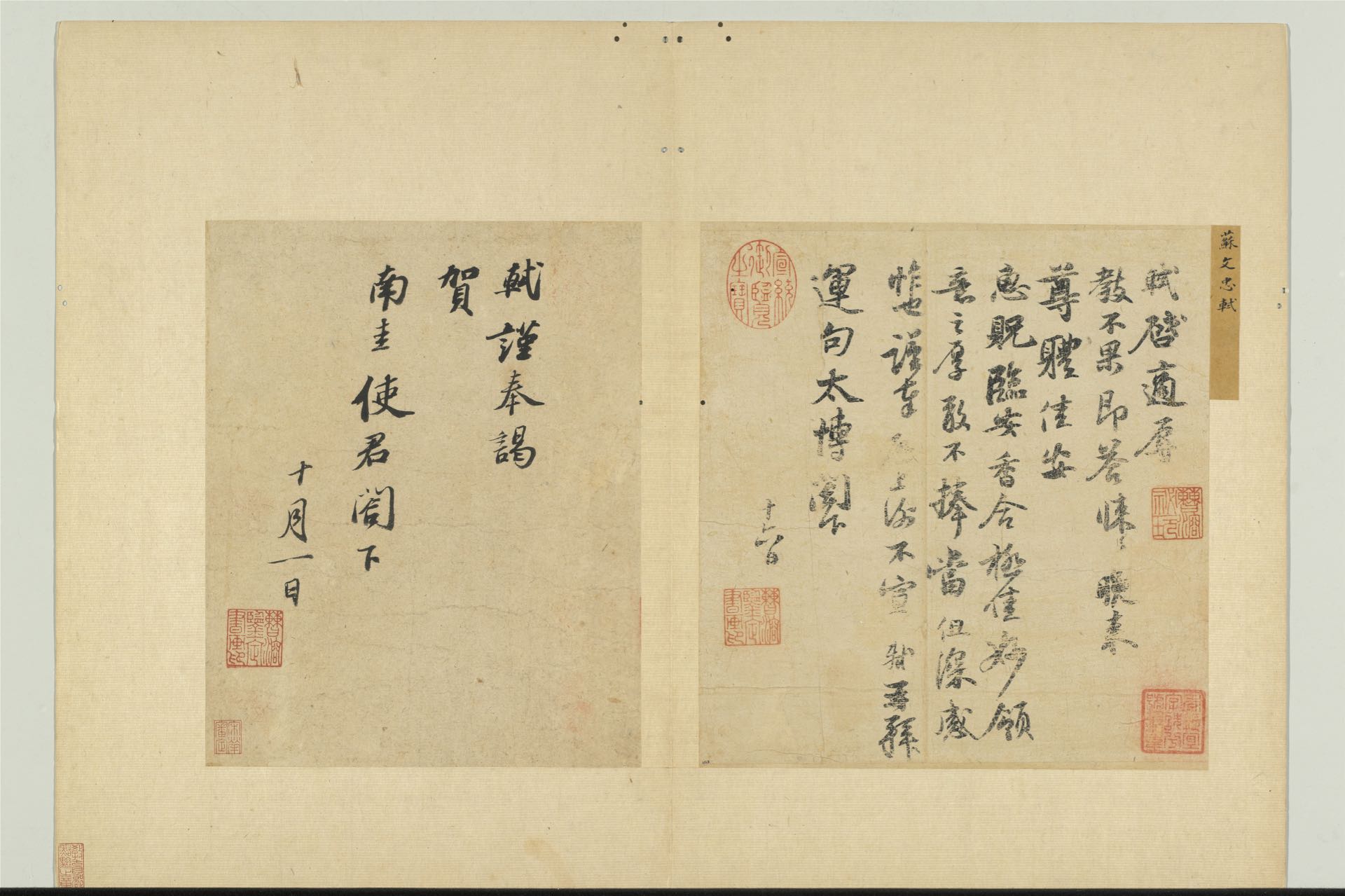 蘇東坡《致運句太傅尺牘》,用筆秀勁,線條流美,「惠貺臨安香合。極佳妙」,感謝對方致贈「臨安香合」(盛放香料的容器)。在剝落的墨色下,書寫用紙上的底紋花樣若隱若現,折枝梅羅紋砑花粉箋,梅花情態襯出書法暢逸,情調雅緻。
