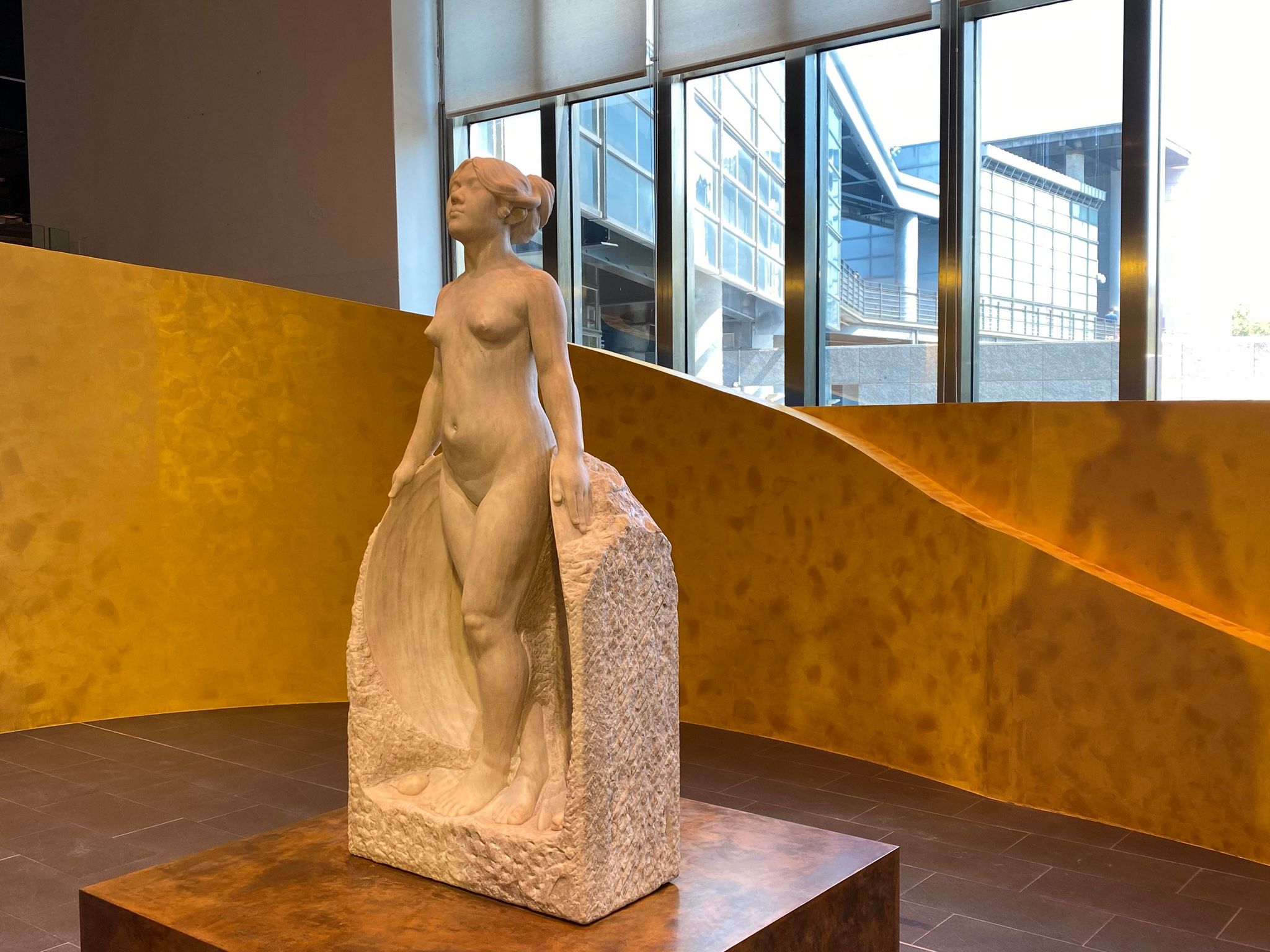 《甘露水》即日起將以典藏展規格,於國美館大廳右側的獨立空間進行展示,除了能讓觀眾以各種角度欣賞作品,該處的玻璃隔窗更讓觀看的視野可以延伸到美術館園區的戶外空間。與美術館大廳另一側所展示國美館館藏另一件作品《水牛群像》相互輝映,表達對黃土水的推崇之意。