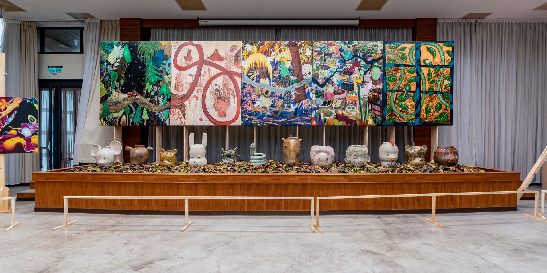 該五連屏畫作,好比展覽的序曲,有如一條蜿蜒的路徑,由右至左,穿行在五個不同的世界,正如生命中的不同階段青春、盛夏、入秋、衰老、超脫…,藝術家充滿標誌性的樹人與動物開著車,手上的樹枝,舉向星空,黑夜在濃密森林的中間,造就一條通往宇宙太初的銀河。另一方面,「森」也是對大自然原始之美的禮讚,呼應了其他藝術家的生命議題。