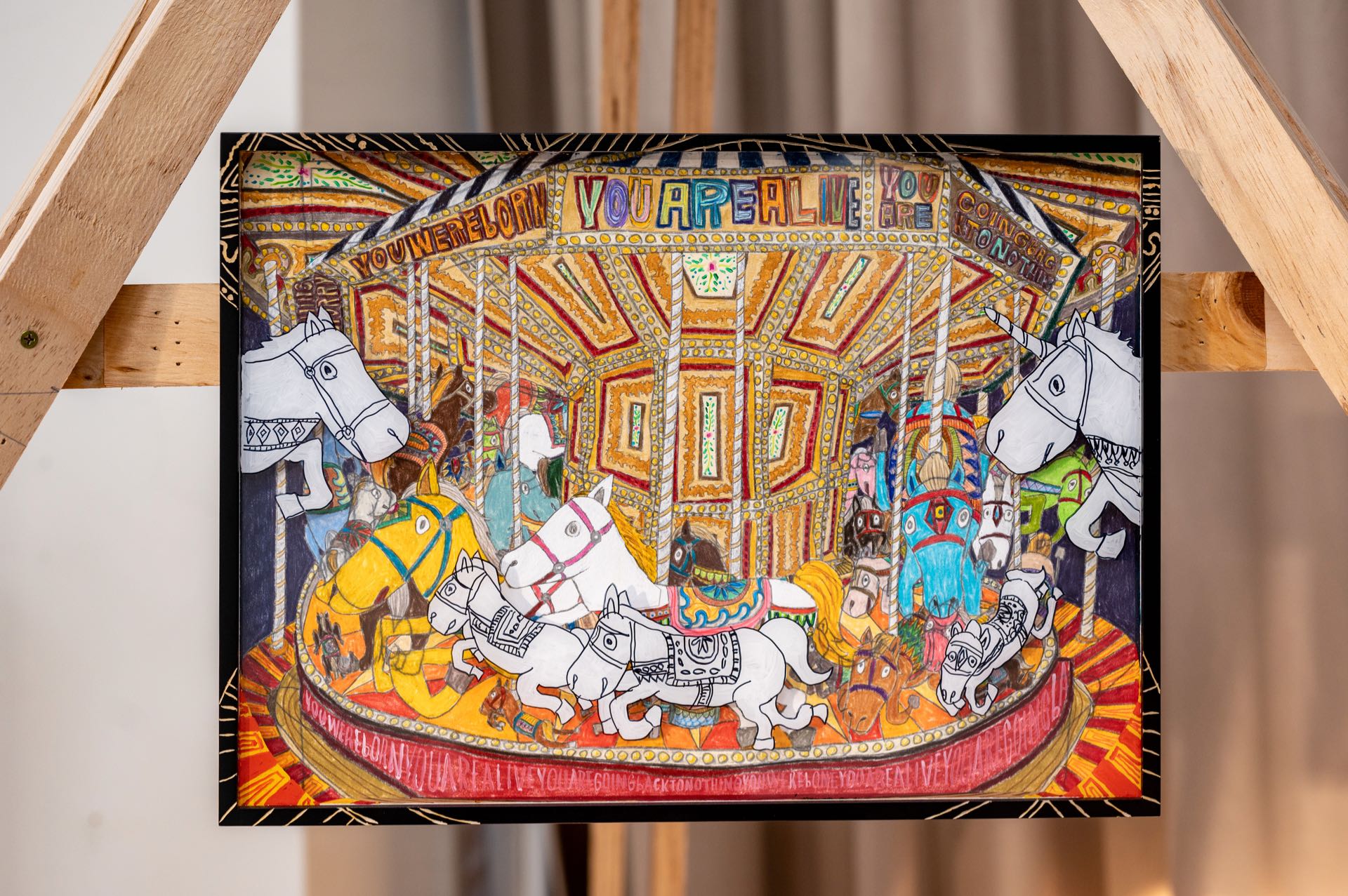 三宅信太郎用「遊樂園」代替了「人類生死」和「自我意識」的基本主題,而作品《旋轉木馬》,代表著,現在、過去、未來,輪迴重生。