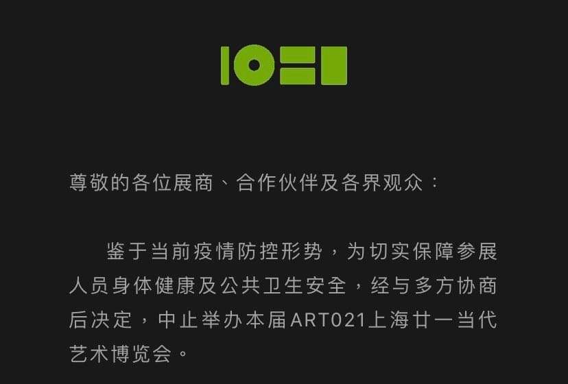 晚間,ART021主辦方正式宣布本屆展會因防控措施,正式結束。「鑒於當前疫情防控形勢,為切實保障參展人員身體健康及公共衛生安全,經與多方協商後決定,中止舉辦本屆ART021上海廿一當代藝術博覽會。因展會中止舉辦給大家造成的諸多不便,我們深表歉意,亦會盡全力處理好後續事宜。」 後續國際展商是否能順利撤展,相關展位費用是否得到補償,仍待後續主辦方實質與參展畫廊協商。但ART021僅開幕一日,隔日瞬間因為疫情防控措施關閉,也顯見目前中國嚴格的新冠疫情管控,仍可能會造成無法預測的風險。