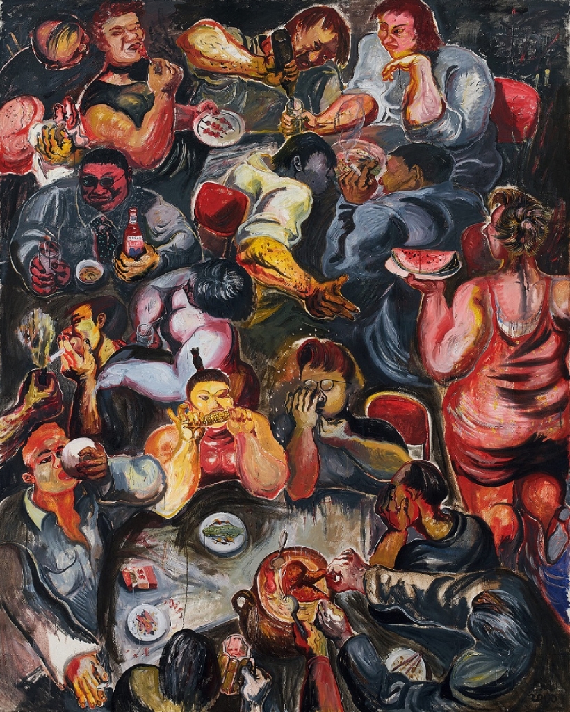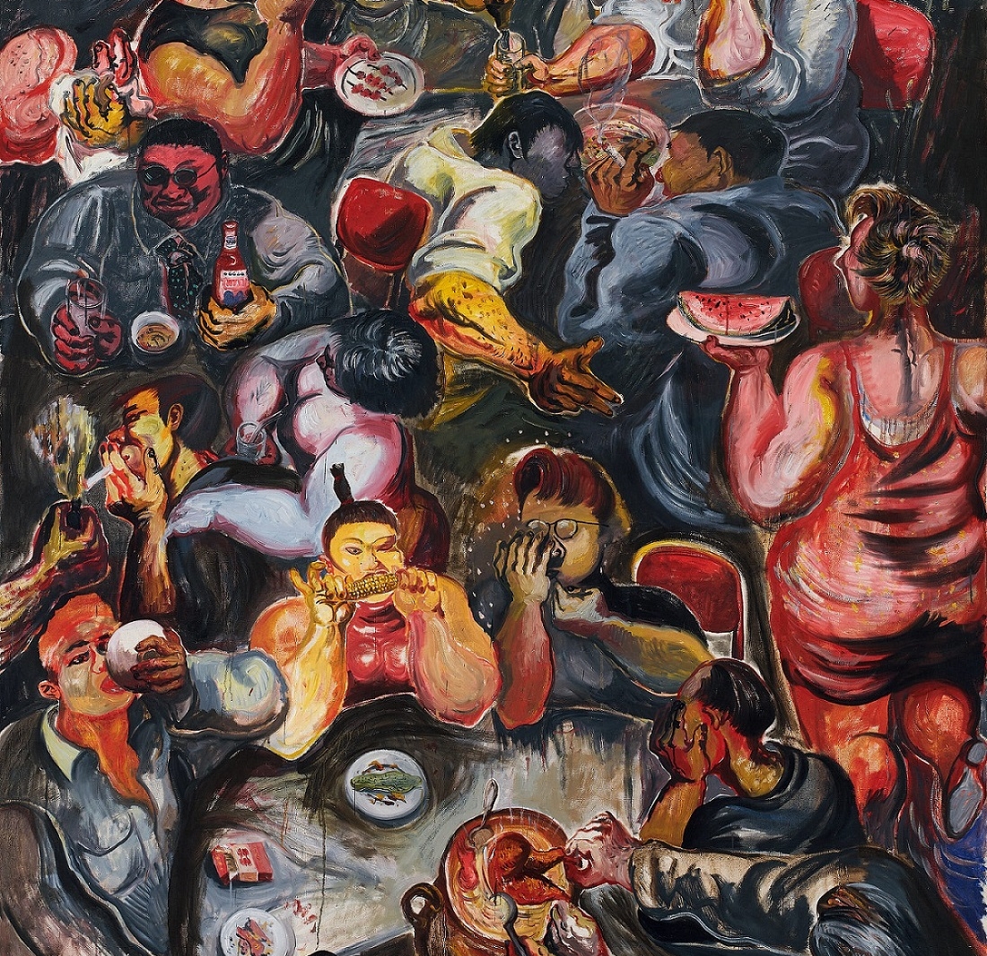 作為此專場領銜之作的張恩利《盛宴4號》創作於2000年,為「吃」系列第一階段的最後一件,充滿畫面的十餘人皆做著與吃相關的動作,展現血肉之軀本能的欲望和衝動,直揭世紀之交的當代人內心狀態亦帶給觀者強烈的衝擊,以低預估價兩倍有餘的1,725萬人民幣成交。作為中國當代青年藝術家團體N12成員的梁遠葦,在本場上拍的《雙聯繪畫2010-1(雙聯畫)》為寬達6米的巨作,引發買家之間近10分鐘的來回競價,最終以1,725萬人民幣高價成交,與張恩利雙雙刷新個人拍賣紀錄。而同為70後藝術家的代表人物,也在本場受到藏家熱烈追捧,如:歐陽春的《孤獨症》創作於2012年,帶入在北京獨自生活十年的感知,以濃厚的自傳意味引發身處同一時代的眾生共鳴,以724.5萬人民幣成交;韋嘉的《白頭到老II》以白髮少年欲語還休的沉鬱神情,成熟地擔起藝術家在2008年之後轉型之作,也拍出逾高預估價的437萬人民幣,均為他們締造個人拍賣新高紀錄。