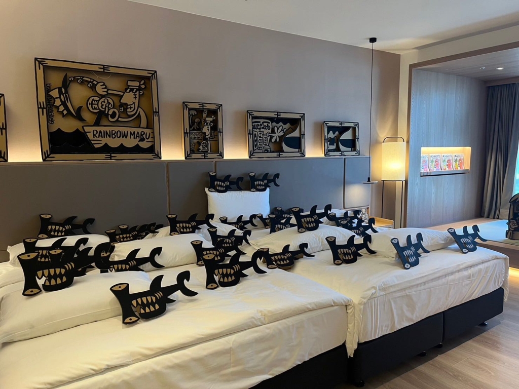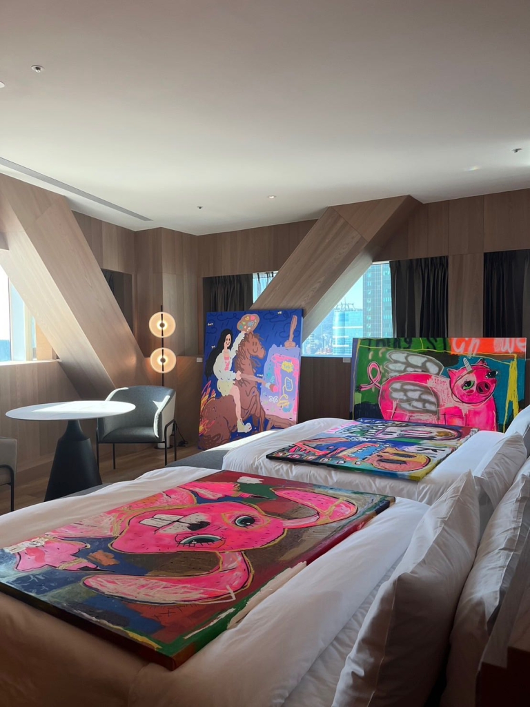 承億集團藝術長黃韋維表示,這次展會充滿許多流行音樂與潮流元素,飯店大門處朱晨維的螢光色飛天馬《SUNNY 》,與躺臥在大草坪Abei劉正堃的超大型充氣人偶裝置《放空時光 Lay Down And Take It Easy》共同迎賓,同一系列「Maskboy 」也在25樓閱讀廣場與觀展民眾一起遠眺西子灣;藝術家戴明德在 25 樓呈現本次展會中最大號的作品《城市漫步》,以繽紛的色彩結合 眾多的魅影人物,展現了人與人之間不同情節的接觸互動;喜愛流行音樂的朋友絕不能錯過,為《以父之名》、《牛仔很忙》、《馬德里不思議》等等知名流行音樂作詞人、集合作家與藝術家身分的黃俊郎,以「快閃工作室」方式展出歷年5本插畫著作、詞作、結合大型繪畫現場創作、進行一場跨領域的藝術展演。以及金曲獎最佳MV導演、及張惠妹ASMR世界巡回演唱會NFT藝術總監的新媒體藝術家王宗欣所帶來的插畫藝術系列作品;在由亮光文創與本展會攜手合作的「走進林夕的詩情世界」特展,可看到著名的詩人林夕嘗試以圖像結合新詩的版畫,其大幅書法作品亦延伸展示於25樓酒店大廳公眾空間;來自韓國的L GALLERY,限量展出作品曾被多位韓國明星收藏、韓劇《雖然是神經病但沒關係》與《男朋友》的御用插畫家Jamsan(蠶山)吸睛的原創插畫「Rose From the Stars」系列 ,以及近期作品曾被韓國國立現代美術館收藏的媒體藝術家金永俊動態影像作品;在承億酒店最標誌性的24樓高空懸挑透明無邊際泳池,水面上張育嘉的巨大黑色章魚氣球「美獸」和陳普「黑青」系列充氣裝置,為觀展民眾帶來強烈的視覺感受。