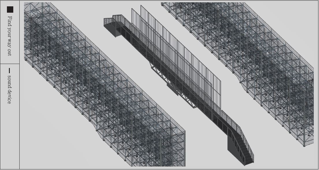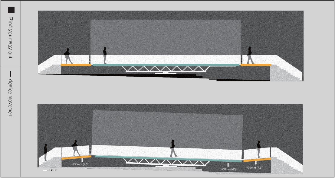 團隊預計在臺北市立美術館(簡稱北美館)的戶外廣場,豎立起兩道8公尺的高牆,間隔出寬約1公尺可供穿越的走道。中間的構造為一大型蹺蹺板通道,配合頭尾兩側的阻尼器減緩震動,觀眾腳下的地板會隨著重心轉移以正負4度的傾角平緩地落下或抬升。蹺蹺板的地板內裝載5000顆鋼珠,也將隨裝置的傾斜而流瀉出聲浪。通道兩側的壁面以繩索密接構成,行走時可感受指尖撥動繩索的觸感。隨著蹺蹺板的飄盪間,或隨著陽光的照射角度與視覺變化、甚至是挪移身軀時改換的觀看視角,包覆在高牆牆面上的雙層網格將出現「摩爾紋」的條紋干擾現象,儘管看似動態卻紋風不動,卻為觀者帶來視覺上的動感以及閃爍。