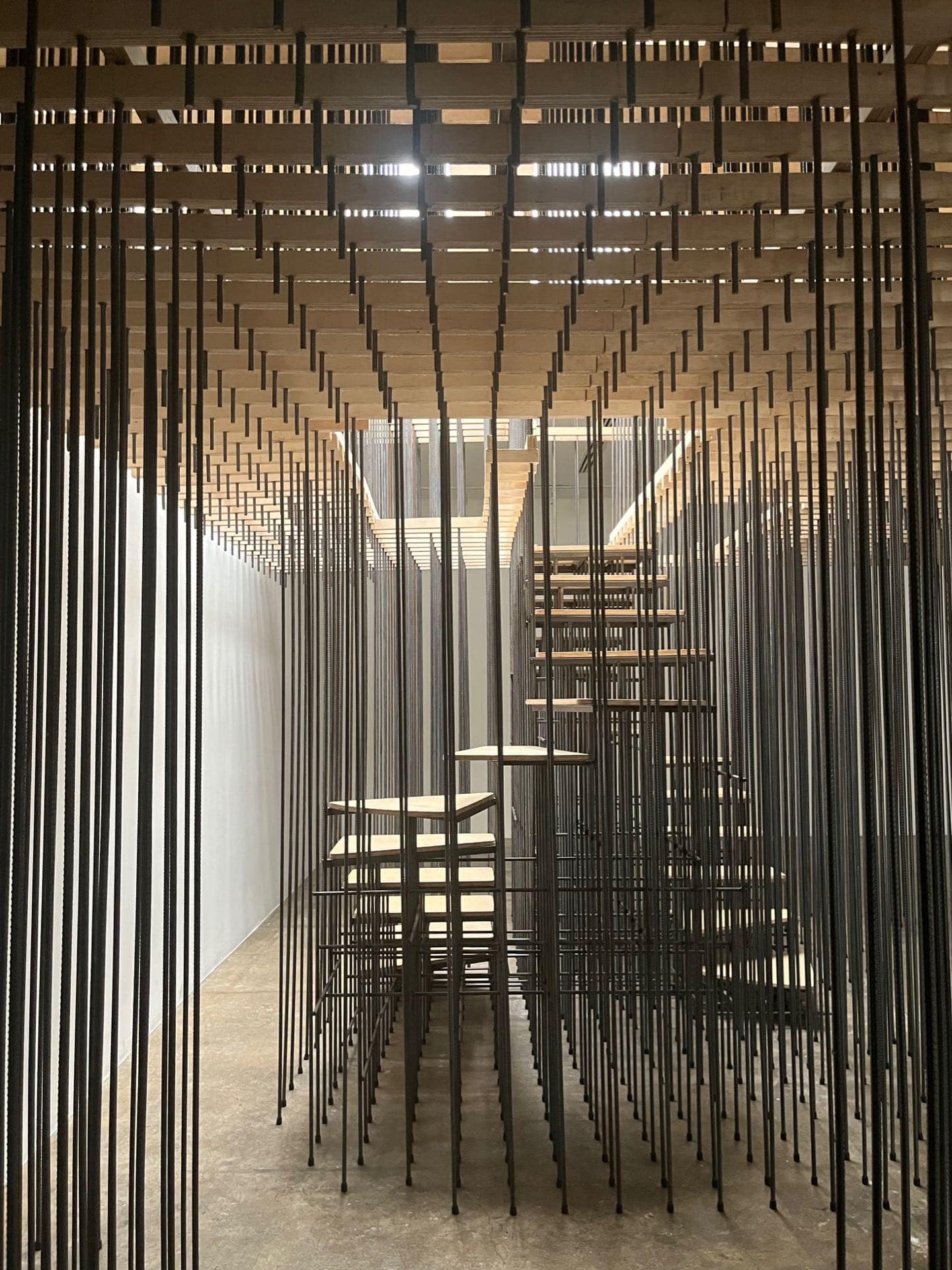 該展覽相較於曼谷市區一般常見的以販售平面以及雕塑類作品的展覽,更著重於重建觀者對於這個空間的感知,藝術家以鋼木結構,引領觀者從不同的高度、方向與身體動作來重新認識/感知這個空間。而這樣的裝置設計也讓我想起前陣子忠泰美術館剛結束的展覽「感知現場」所欲操作的「空間如何被重新感知」的企圖,建築師林伯陽純白、輕巧的樓梯,與藝術家王德瑜的幾乎貼滿整個空間的超大型氣囊,皆利用異材質的轉化、接合、拼貼、覆蓋,創造了觀者對於現場空間的新體驗,亦同樣帶領觀者在不同的尺度裡,重新認識身體與空間的關係。相較於「感知現場」的不穩定、變形、柔軟、晃動、純白的基調,「FIELD COLLAPSE」反而呈現的是一種堅硬、冰冷、幾何造型的氛圍。然而,除了這種既抽象又主觀的「感知」外,關於這種高度仰賴觀者的沈浸式體感的空間裝置作品,我們還可以從「FIELD COLLAPSE」來討論什麼?