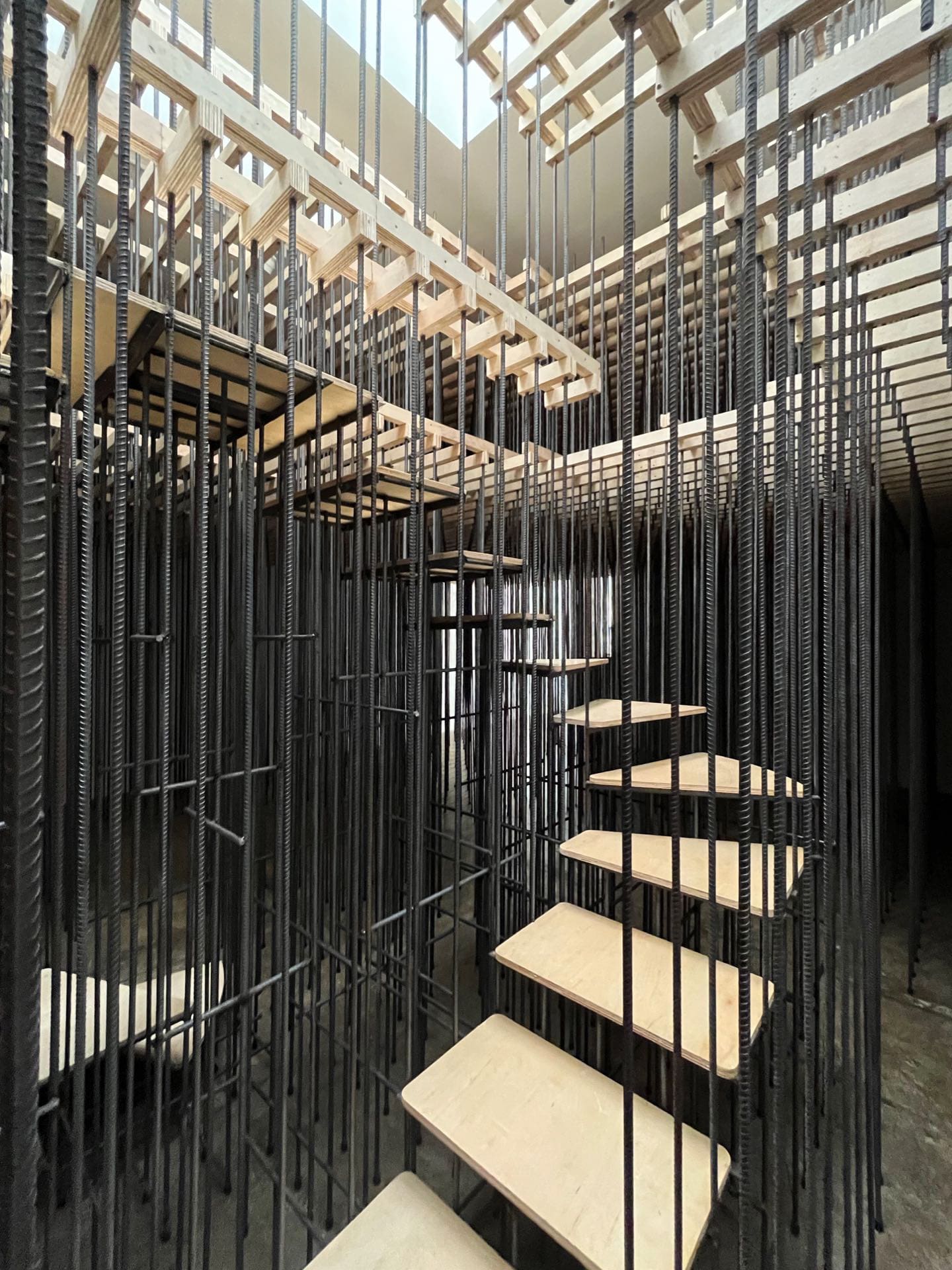 現正(2023年3月)在100 Tonson Foundation展出的展覽「FIELD COLLAPSE」(瓦解場域),由具建築師背景的藝術家Savinee Buranasilapin和Tom Dannecker共同製作完成。該展覽以建築工地為摹本,用鋼筋、木棧條作為主要結構,並依照特定地點與空間型態打造一座大型的裝置。觀者進入展場空間後,首先會先順著著裝置中鋼筋空出的走道往內部移動,接著踏上木板搭建的階梯,一階一階往空間上方前進,當踩在最高的階梯上時,觀者身體會鄰近空間頂部的霧玻璃窗,陽光從玻璃窗外半掩著灑入,幾片落葉的剪影亦映在玻璃上。接著再走下樓梯,從另一側的出口回到一開始進入展場的地方。