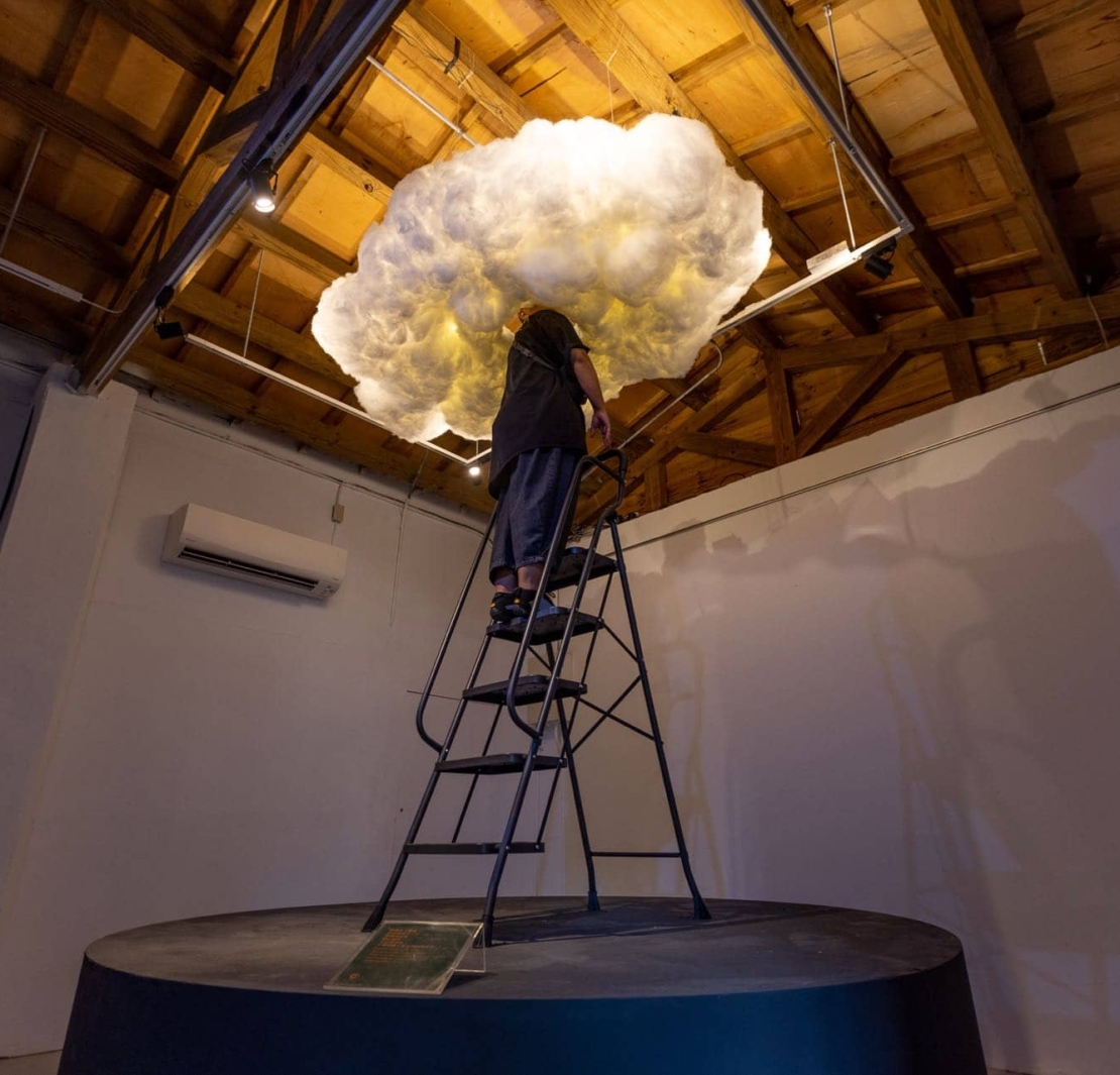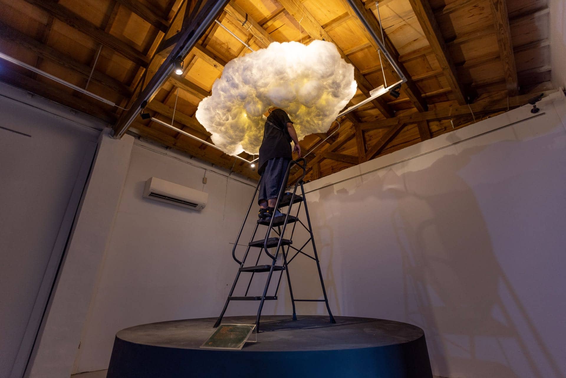 依照參展動線首位遇到的作品鄭烜勛〈聽說雲上好像有一個世界〉,也是英雄旅程的第一站,第一站通常都會是一個美好世界的呈現,但對他來說一個很美好的世界非常遙遠,所以他將一手打造的微縮模型世界放置在雲的另一邊。作品也延伸他取佛經故事中「蜘蛛之絲」的畫面感來打造,觀眾可爬上現場的階梯一窺雲上的另一個世界,同時雲上的世界中會有一台小攝影機也正在觀看前來窺看的觀眾。鄭烜勛除了創造了一個想像的世界,亦探討觀看之間的權力與方向關係。