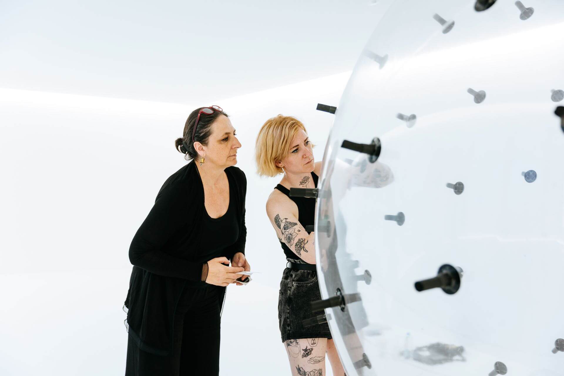 此外,還特別邀請德國藝術家Karina Smigla-Bobinski帶來曾在全球各地展出之知名互動藝術作品《ADA》,大型透明塑膠氣球中注滿氦氣,外層裝置有300根炭筆,觀眾可以用力推動、轉移、拋接、玩耍,與《ADA》互動,在全白空間中留下共創的塗鴉線條與記號痕跡,也讓展間的樣貌時時刻刻都在變化,充滿了各種有趣的不可預測性。