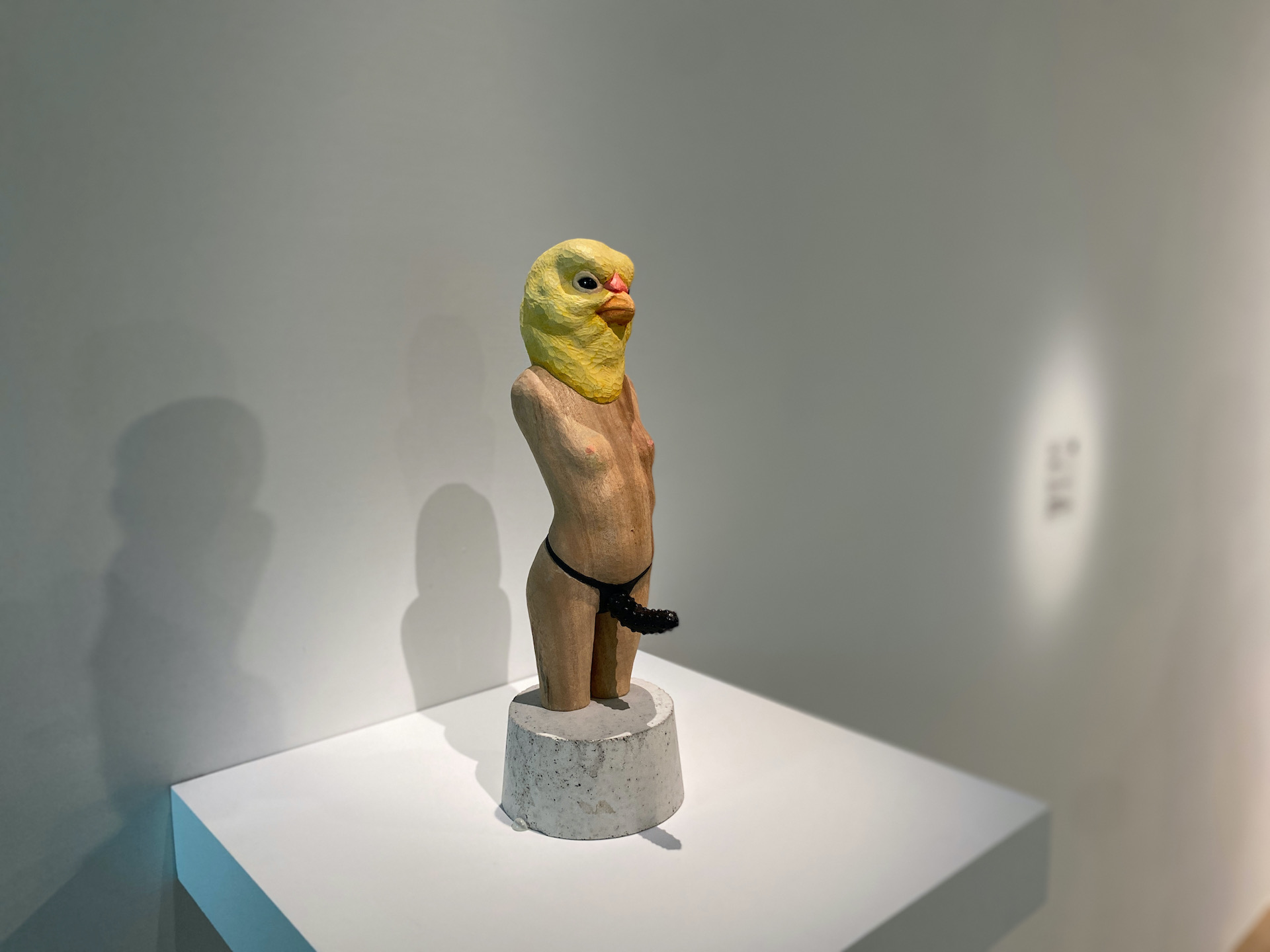 例如,《合群系列I&II》裡同樣臉孔的男性,穿著同樣的西裝,對著展場搖晃、點頭稱是的機械式舉措,是為了讓社交運作如人物雕塑底下的那顆不鏽鋼球體般平滑的同一性;何孟娟「梅蘭竹菊」中女性的俗艷裝扮、背景的台灣步登公寓景觀,以及身體與服裝因為無法克服引力而緊貼在透明片的擠壓感與「地味」,幽了女性必須在時尚中表現輕盈脫俗的社會框架一默。木雕作品《蜜桃成熟時》則表露了對陽具主義的反噬,少女初長成的性徵與雞隻青春期的相貌,搭配以不同木頭雕刻而成的穿戴式陽具異物,看似柔弱的形像結合攻擊性的意象──她有屬於自己的武器,而不必等待英雄到來。