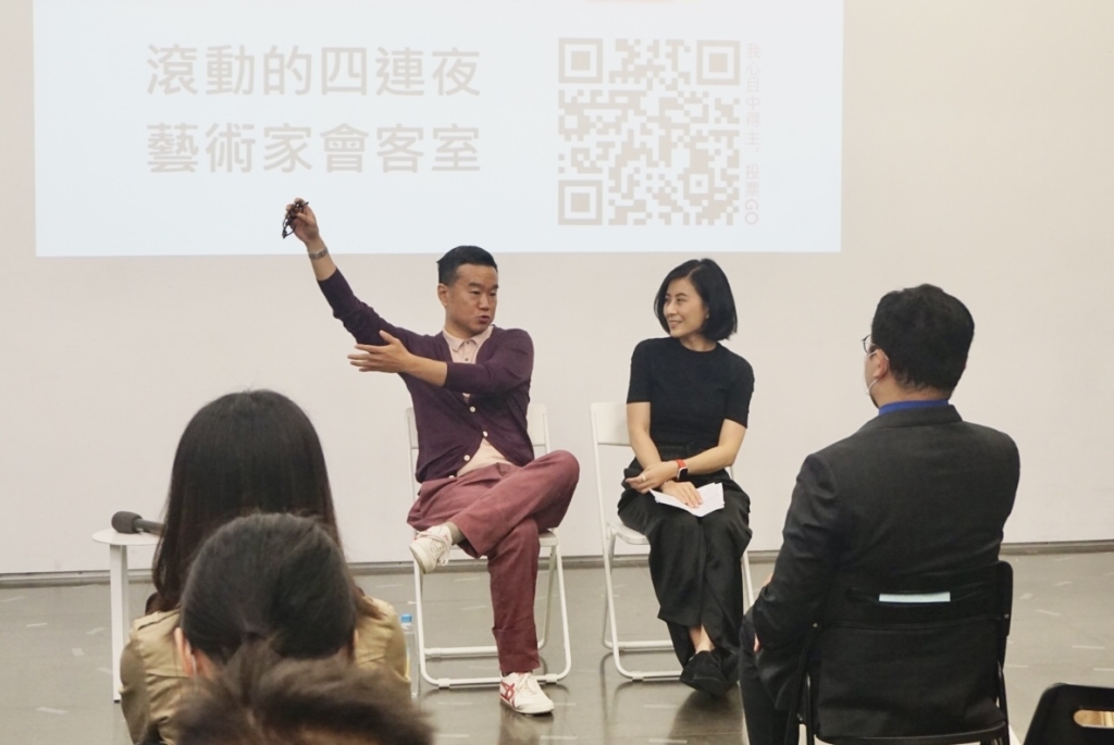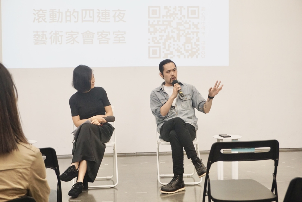 承接著前兩夜的討論氣氛,5月11日及5月12日的「滾動的四連夜—藝術家會客室」繼續在北師美術館一樓,邀請大家一同回顧入圍第21屆台新藝術獎的作品,由來自不同領域的創作者與藝文關注愛好者們針對入圍者的分享,進行提問及表達感想。