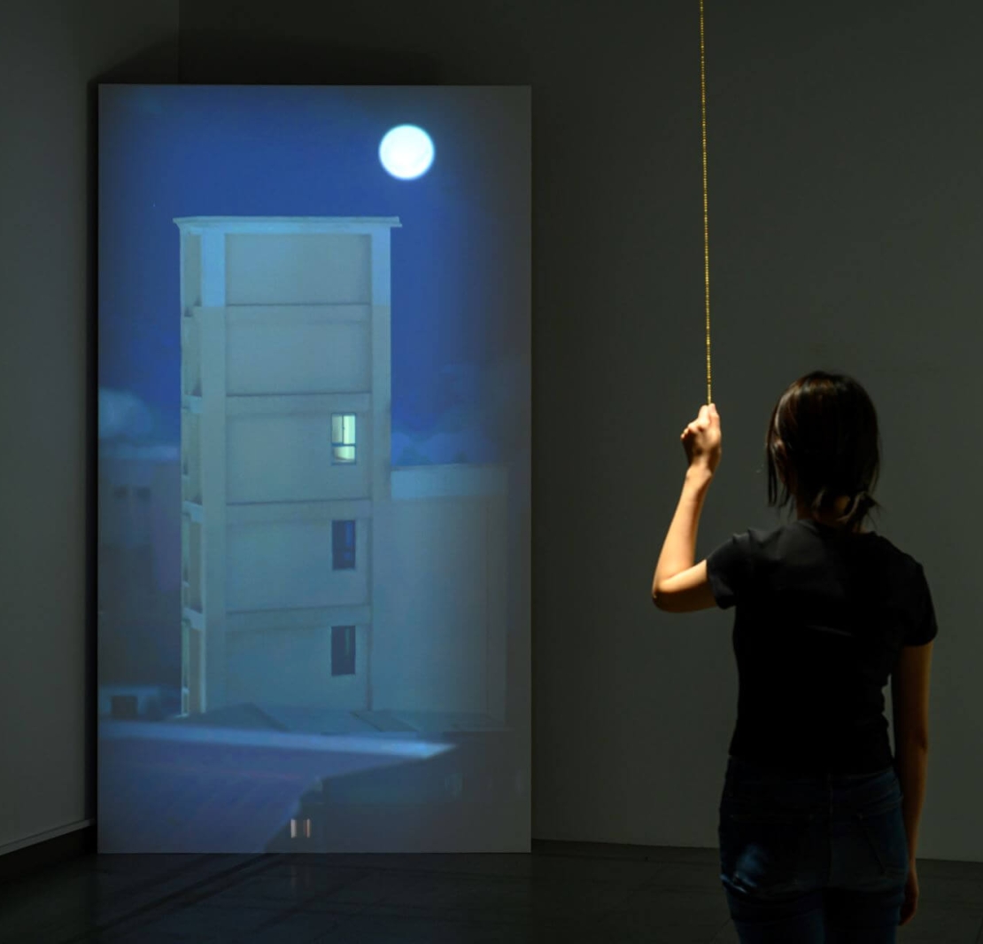 《日常時光》則是一件三組影像裝置,作品以輕巧的姿態,探索數位虛擬與真實世界的邊界。林哲宇透過程式設計,連動投影畫面中的虛擬開關與燈光,當影像中的燈被關閉或者調整亮度,展場中燈的亮度也會跟著改變;或者反過來,當觀眾拉動其中一組的現場開關,畫面中大樓的燈也會隨之開關。這件作品發想自一個日常經驗,有天藝術家在陽台曬衣服時,看到對面房間的燈突然的明滅,因為光線這微小的改變,讓他意識到對面大樓有人居住。觀眾在展場空間裡中拉動開關,把作品中某人家的燈給關掉,彷彿我們所處的此時此刻,與某個未知時空甚至完全虛構的世界,以這樣幽微的方式相連。