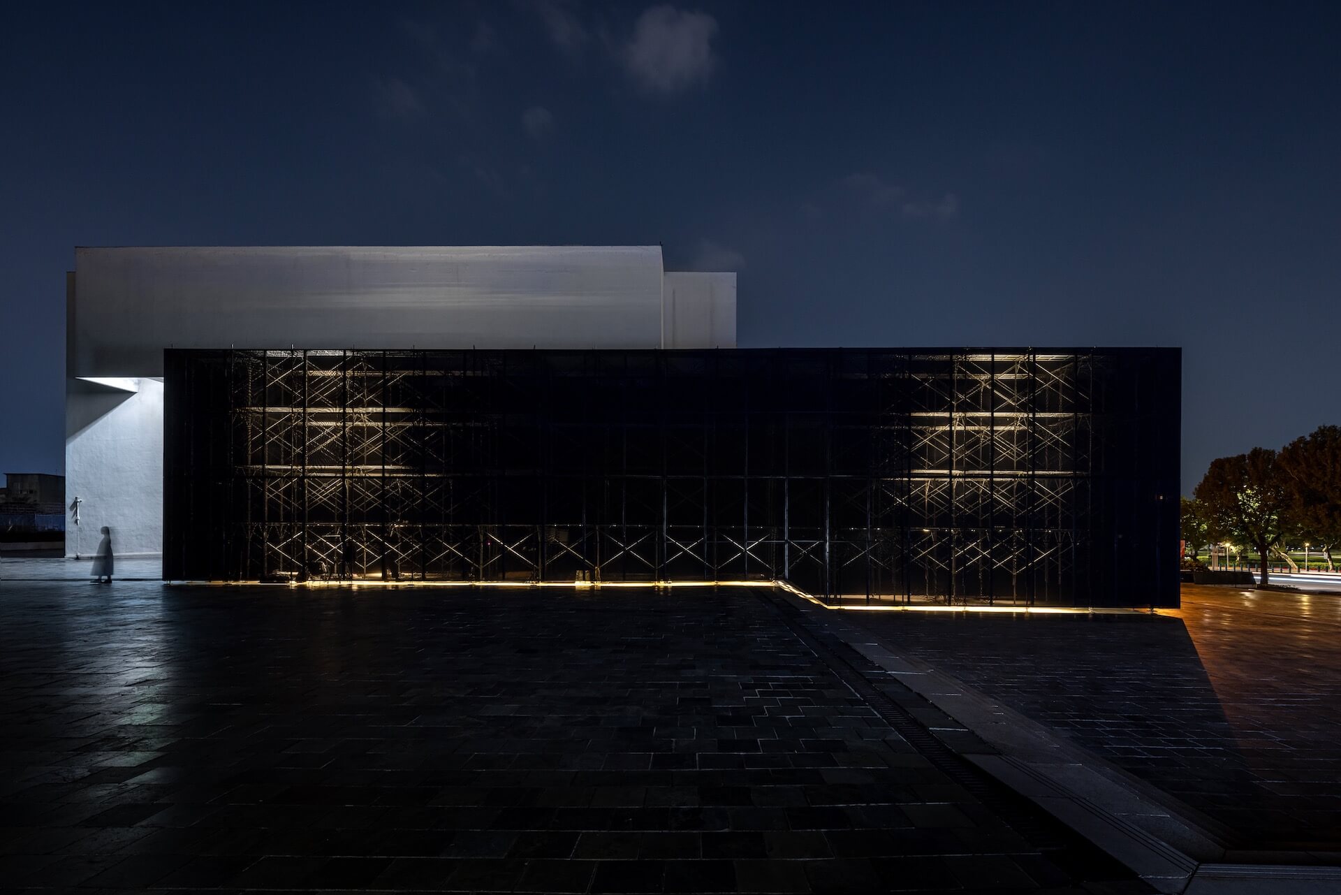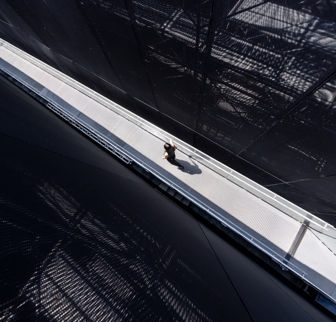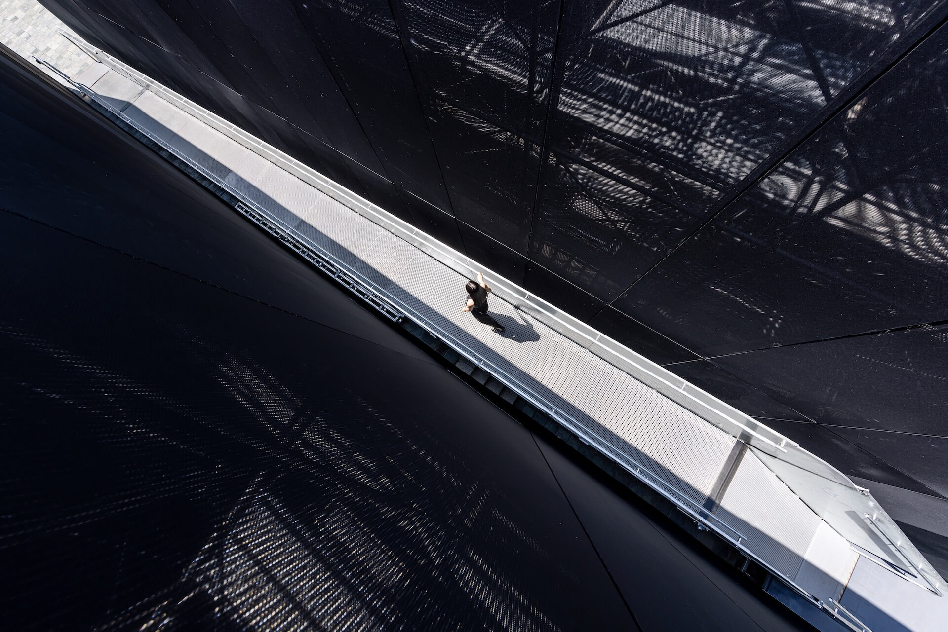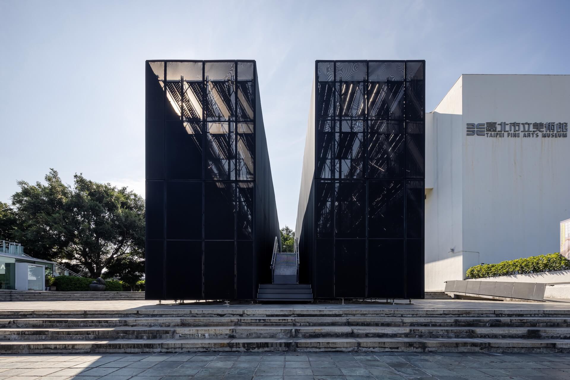走近現在的北美館戶外廣場,我們無法不被眼前龐大的黑色塊體給吸引,甚至在一定距離下,會覺得它就像是美術館館體另外延伸而出的另一個空間結構。這兩道高達八米的黑色網面高牆間,是一道寬僅兩米的廊道,沿著從中山北路一側往美術館入口、廣場中心的直線延伸達三十米;廊道的地板隱藏著一座巨型蹺蹺板,將隨著行者步伐與重量的連鎖影響而緩升、緩降,與此同時,腳下數千顆滾珠也將如雷雨、激流般奔盪出聲響。在這受限、包裹,宛如一線天的峽谷中,時間得宜可以看到黃昏後逐漸西落的金星位居正中。