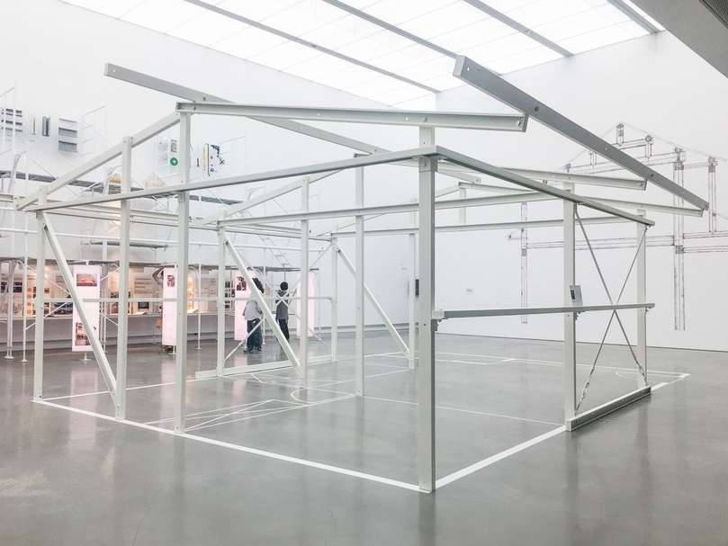 鷹架構成的牆面與展間,充滿著進行中與未完成的氛圍,穿梭在鷹架間,結構的聲響,讓行徑的步伐總是無法過於鬆散,在鷹架隔間閱讀展示的資料與書籍時,更得以進一步感受,每個計畫現場的篳路藍縷和胼手胝足。然而,美術館的展示何嘗不是有待參與的公共空間,而對謝英俊所執行的計畫而言,最適宜的展場,不只是在營建的現場,甚至是在參與建築,或是抗議活動居民的經驗分享之中。