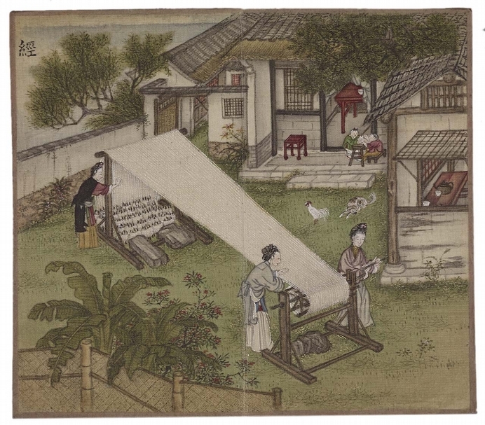 這套〈耕織圖〉冊尺寸極小卻不乏細節。以〈經〉一開為例,細小如婦人的手指或是雞毛都有一定程度的交代。圖像構成與康熙皇帝另焦秉貞繪製的〈耕織圖〉版本有相近處,卻又有所調整,耐人尋味。