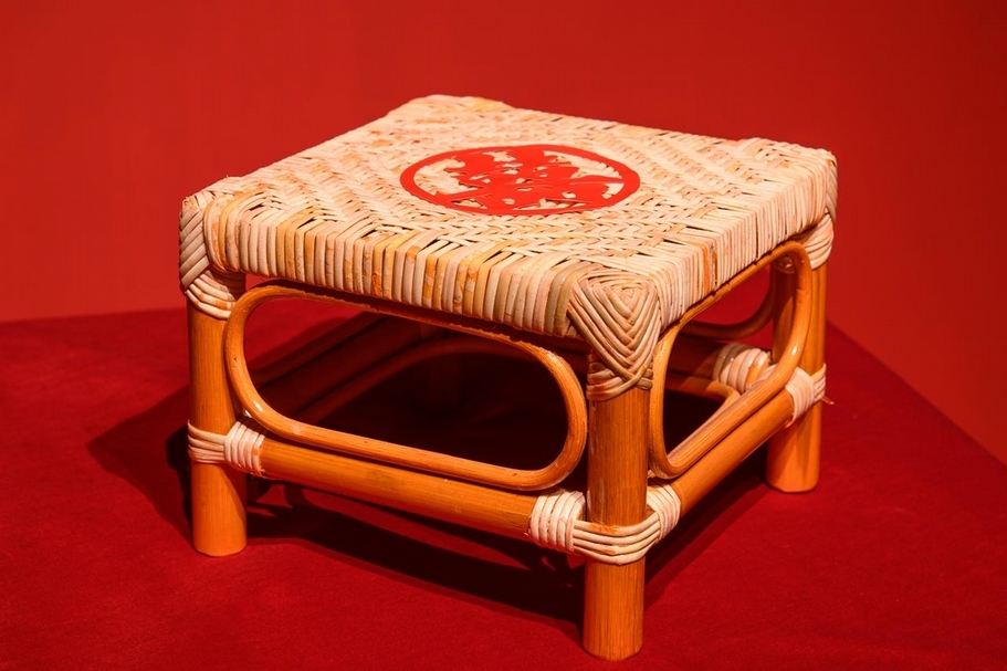 作為展覽宣傳品的主視覺中心,一張不到一呎見方的籐編矮凳安置於入口廊道的盡頭,也是展呈動線上的第一個醒目物件。這張椅子本身看上去尋常到似乎每間老厝內都會見到一張,卻不一定會讓人馬上意識到其最初的功用:它是供產婦坐著生產的生子椅,也是傳統習俗中的必備嫁妝,因而也被稱作「富貴椅」。在鮮紅的牆面、地面構築的垂直空間內,它被置於覆以層層紅布的紅色展台上,在兩束投射燈燈光聚焦下被「聖壇化」。這種「聖壇化」的設置讓它脫離了日常情境,又在美術館場域內成為串聯起其他所有敘事片斷的中心節點,乃至折射出各種相關敘事的「晶體」。有趣的是,生子椅在整個展覽其他部分中並未直接提及、指涉或再現,它既是一個明確的實用性物件,也成為一種概念化、意象化的文化載體。陳建北在這裡並未使用帶有歷史感的舊椅,而是放置了一張新購的椅子、並鄭重貼上大紅「囍」字,無論從視覺聯繫上、還是結合展覽其他環節的內容佈局來看,都凸顯了生子椅所具有的「喜慶/生死關」之雙重意涵,與之相對應地,「婚禮紅/血紅」的雙重意象也同時化現在這一方空間的顏色配置中。