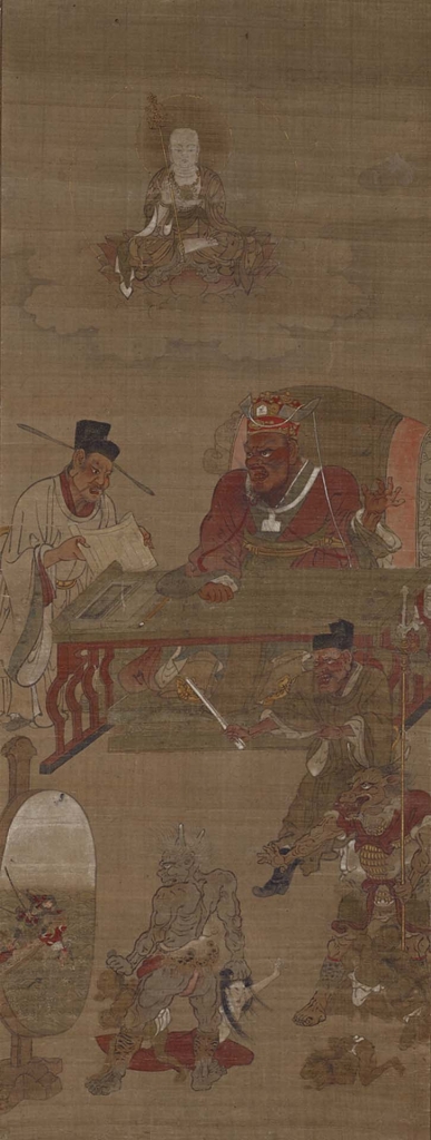 大和文華館的《十王圖.閻魔王》就是這類十幅一組的十王圖之一。閻魔王是在冥界審判亡者生前業報的其中一王,據說死後的第五七日(也就是第35天)會遇見祂。因其嚴刑拷打的審訊和透過淨玻璃鏡與業秤來揭露亡者之罪業等舉措,閻魔王也被用於懲惡勸善和宣揚因果報應。由於與本作屬於同一圖像系統的京都淨福寺流傳之十王圖,已知是為土御門天皇(1196-1231)預修十王齋所繪製的作品,因此本幅有可能也是為了逆修而作。