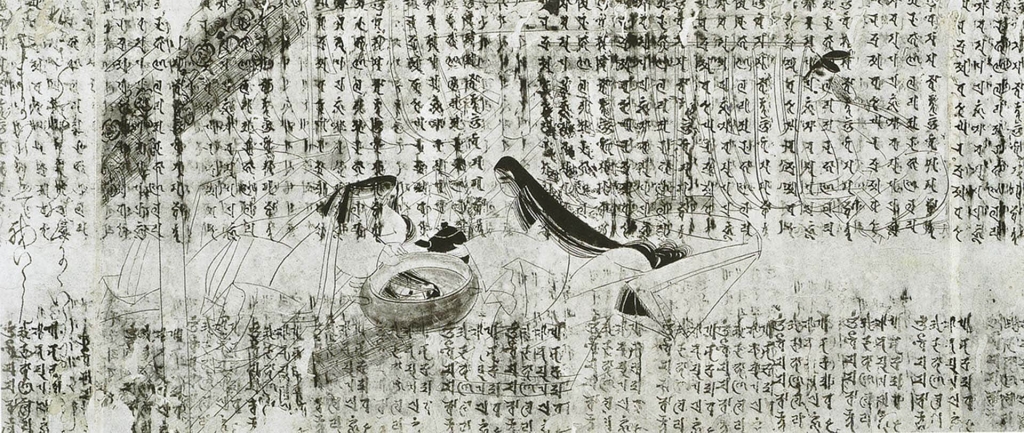 《伊勢物語下繪梵字經》即是在《伊勢物語》的白描繪卷上,滿滿印上了光明真言的梵字陀羅尼。此繪卷上的光明真言,是大日如來的真言密咒,相傳若是受持此真言,亡者便能除去種種罪業,逃離地獄之苦,轉生到西方安樂國土。此作據推測也是為了追善供養已故的繪卷持有人,而以該繪卷為用紙印上了光明真言。