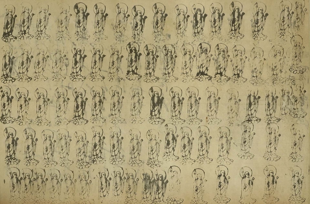 至於《地藏菩薩印佛》(圖7)則是在信函的正面和紙的背面分別印上20尊和83尊地藏菩薩像的佛印。由正面的墨書可以得知,這是一位善士進行日課供養的印佛。所謂日課供養,指的是透過每日鈐蓋一定數量的印佛來積累善根的一種供養行為。透過《大乘院寺社雜事記》等文獻,可以得知存在著以追善供養為目的而在故人生前所寫書信的背面鈐蓋印佛等事,這件作品中也蘊含著為書函之持有人進行追善供養的意味。