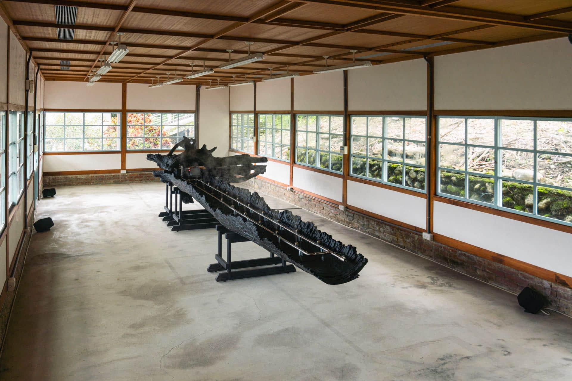 藝術團隊太認真《穿霧》,作品設置在出磺坑的醫務所,一進入空間一顆半剖面的漆黑樟木橫躺靜置在眼前,樟木中間拉了條管線,管線上的噴嘴會在特定時間噴出樟腦油霧氣,空間中瀰漫的樟腦氣味,召喚著樟木在不同時代經濟產業中的身影——不論是早期的電影工業(賽璐璐)、槍砲戰爭、居家生活用品,樟木都是重要的原物料,現今則多被數位工具以及石化產業所取代而逐漸沒落,《穿霧》揭示我們對於山林資源的想像隨著時代的經濟發展而逐漸轉變、甚至是遺忘。