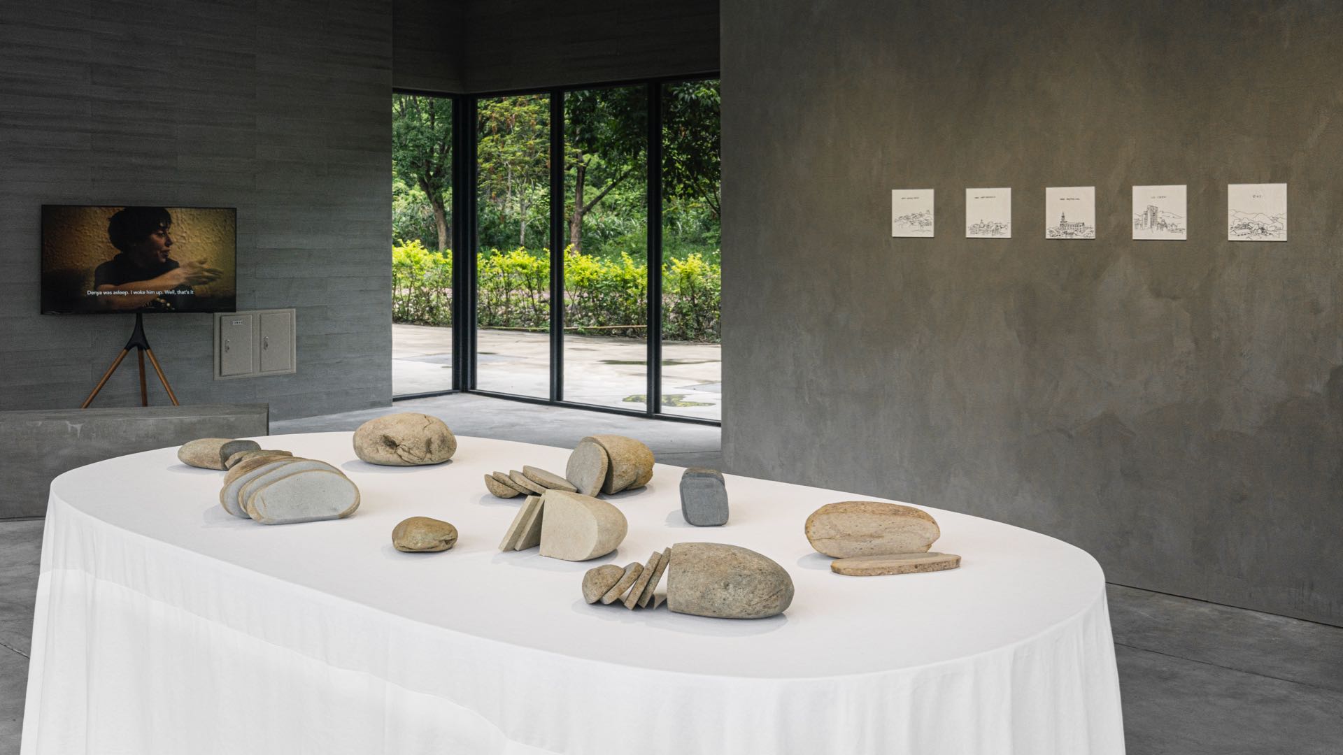 客家傳統文化中重要的「伯公」信仰,也成為國際文化間重要的對話契機。「伯公」為土地神的稱呼,多以「石頭」為祭祀對象,具有祈求保護與平安的重要意義。烏克蘭藝術家詹娜·卡德羅娃(Zhanna Kadyrova)《Palianytsia》將河邊的鵝卵石製作成烏克蘭傳統迎客的圓麵包「Palianytsia」的造型,Palianytsia對非烏克蘭母語的人來說很難正確的發音,因此在烏俄戰爭期間,被烏克蘭人當作判斷陌生人是否為間諜的詞彙。另一日本藝術家岡部昌生《傾聽石頭的聲音》也以石頭來進行創作,他挑選廣島宇品車站(原爆遺跡)附近的石頭進行拓繪。詹娜·卡德羅娃的鵝卵石麵包象徵著保護安全的信物,岡部昌生的石頭也代表著對和平嚮往的參照,他們與客家文化不約而同皆透過「石頭」來展現相似的精神意涵,也因藝術季相遇,有了相互回應的可能。