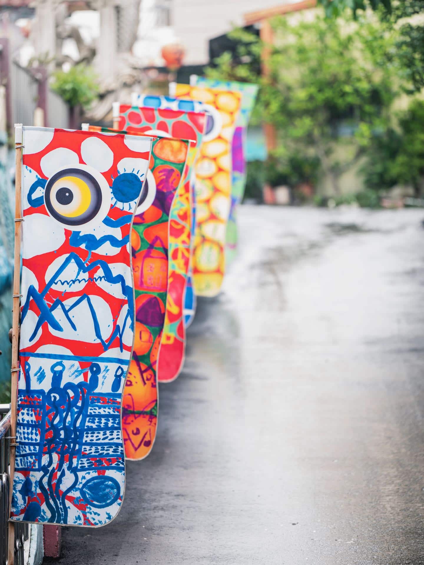 不同於多數藝術家以個人創作來回應客家文化,伊豆見彩《幟》是以「共創」的方式,描繪了在地集體文化的記憶圖景。她與在地的居民、學生、耆老合作,透過團體提問分享,在旗幟上進行繪畫創作,引導參與者思考自身的處境與議題,在當代已被淡忘的傳統文化與歷史中,探索自身的身分與文化認同。