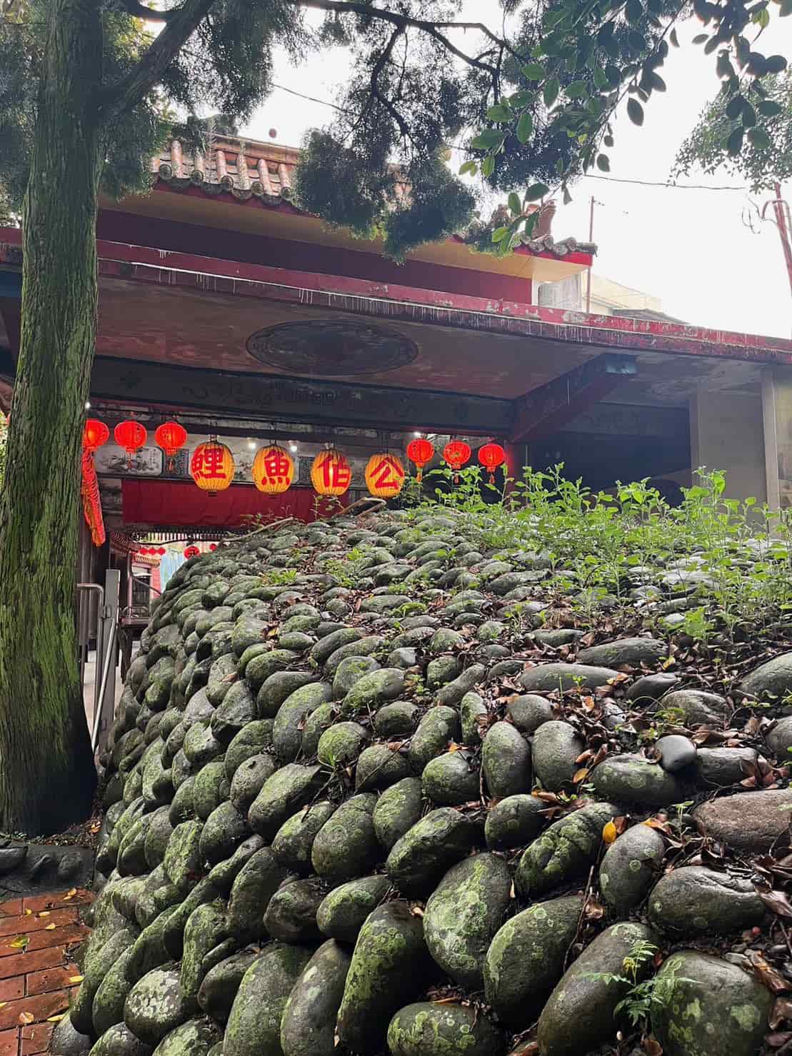 最後,我想提的是沿著《幟》的小徑往草坪更深處走,會見到一件林怡華形容是「第0屆浪漫台三線的作品」。事實上,這件作品並非出自參展藝術家之手,而是來自於兩百多年前居住在此的居民。作品是東勢鯉魚伯公廟用石頭堆砌的石崁。早期東勢因毗鄰大甲溪,溪水經常氾濫成災,人們在斜坡處用石頭砌建石崁,石崁貌似一條鯉魚,一顆顆堆砌的石頭不僅像是魚鱗,也彰顯石頭在客家文化中具有保祐意義的精神意涵。