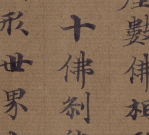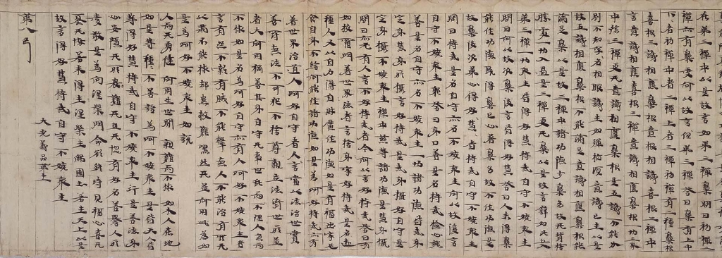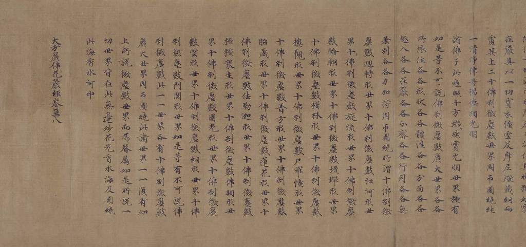 〈華嚴經卷第八〉(圖11)是證聖元年(695)至聖曆二年(699)間所翻譯的80卷本《華嚴經》之一卷。本卷除了帶有折角的端正字體,還使用了武則天(624-705)新制定的文字,因此被認為是漢譯後不久所抄寫的作品。