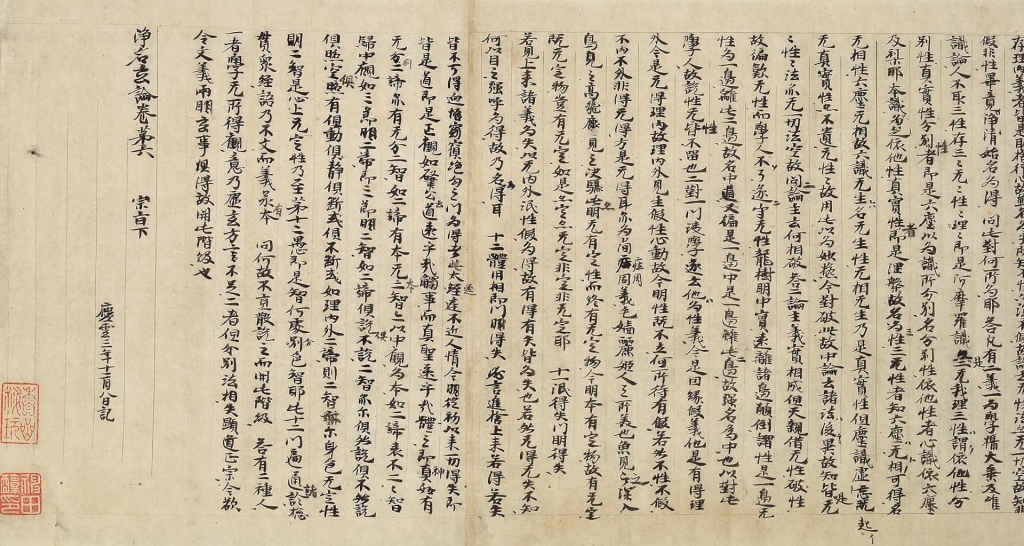 另一方面,日本展品年代上限之作,為宣說《維摩經》要義的〈淨名玄論卷第六〉,其後記可見「慶雲三年十二月八日記」,為日本以紀年表示書寫年代的最古老書蹟,正文以保有六朝(三國至南北朝時代)風情的筆觸進行抄寫。