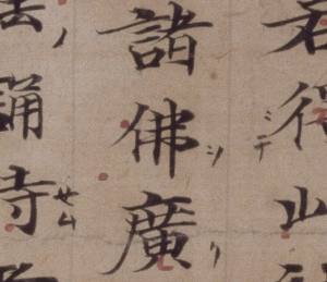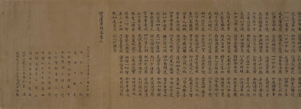 另外,〈法華經卷第三殘卷〉是在官吏的監督下進行抄寫、被稱為「長安宮廷寫經」的經典之一,卷末附有抄經和校經的人員序列。嚴謹端莊的字蹟,出自當時最優秀的寫經生之手,可謂楷書表現的極致。