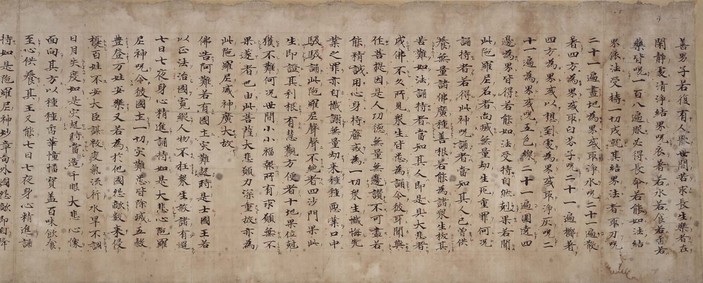 另一方面,〈千手千眼陀羅尼經殘卷(玄昉願經)〉是玄昉(?-746)為了祈求聖武天皇為首的皇族、文武百官與人民的忠孝和安寧而抄寫的經典,據說原來是一千多卷的大部頭作品,但目前僅存這一卷,從中可以看到優美洗鍊的楷書深受唐代書風影響。