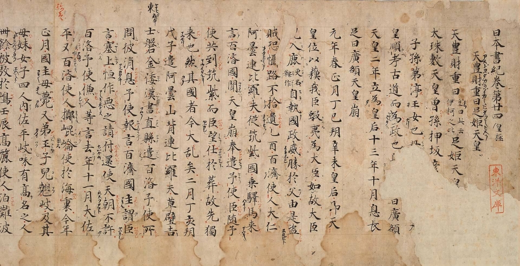 到了平安時代中期,彷彿與「假名」建立同步似的,「和樣」這種具有優美、柔和等表現形式的日式書法開始蓬勃發展,長期以來成為一種規範。原三菱財團本家岩崎家之舊藏品〈日本書紀卷二十四(岩崎本)〉,其筆畫轉折部分呈圓弧形,便與前代書蹟明顯有別。
